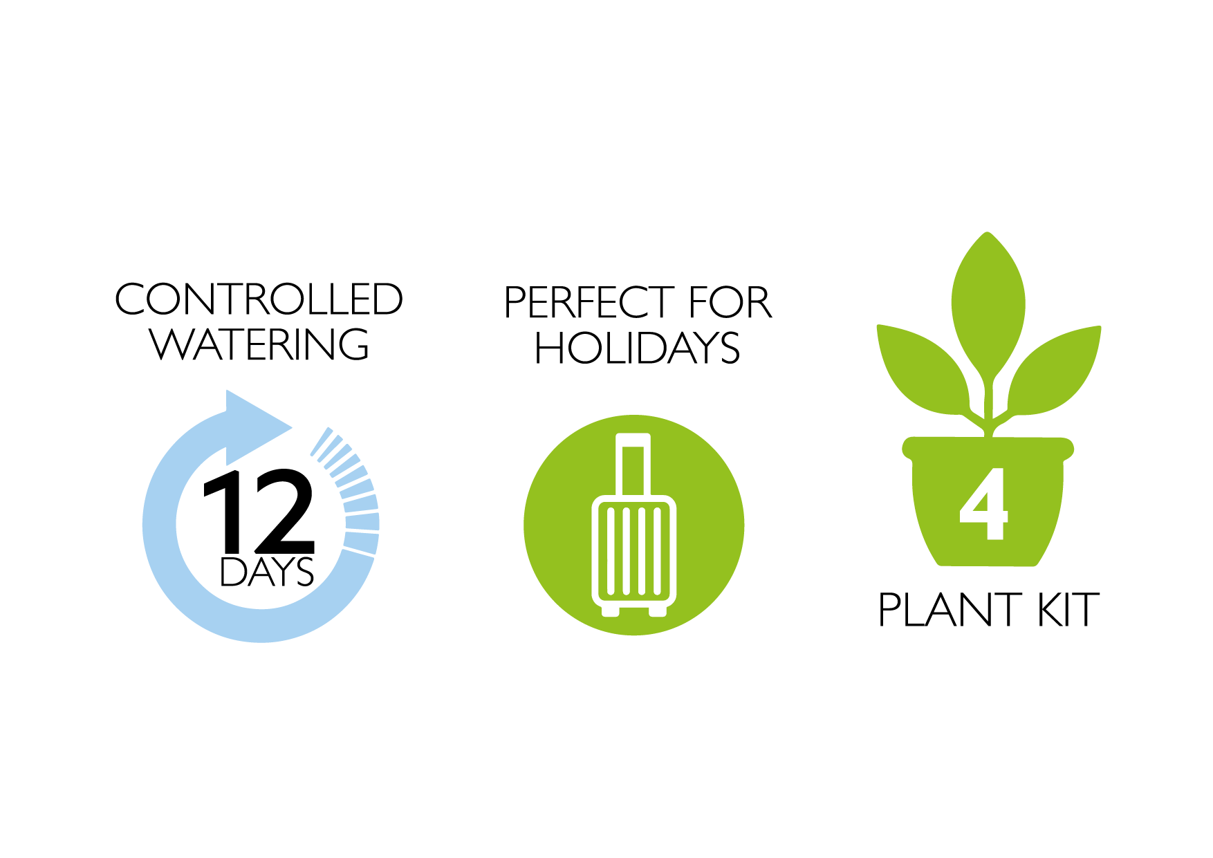 Multi plant watering system for up to 6 plants. Controlled watering for 12 days. Control valve to adjust flow requirements tighten to reduce flow. You choose the water containers. A larger container longer watering. Nylon/polyester cords will not rot. Six multi color and multi length cords. 4 wicks at 19" and 2 at 27". Perfect if you are going away or if you are just forgetful! Push spike down in the roots put the wicking cord in a container of water. Perfect for indoor plants such as: flowers foliage herbs and ferns. 1 lb.
