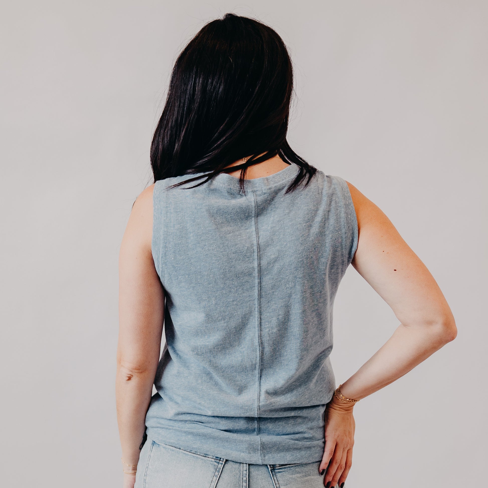 Stay effortlessly cool and casual with this sleeveless knit tank. The lightweight fabric and relaxed fit make it a perfect go-to for warm days. Featuring a classic crew neckline and subtle seam detail at the back, this versatile piece is easy to dress up or down.