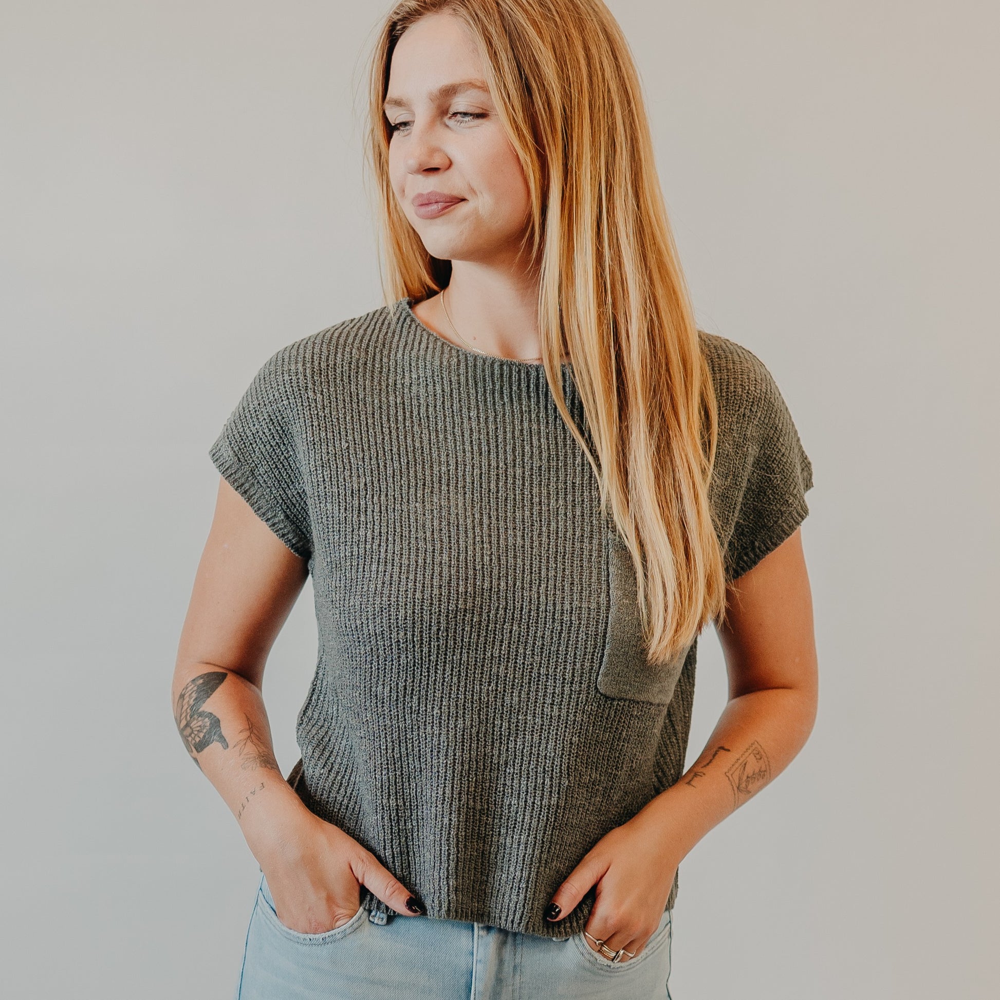 Meet your new go-to knit for effortless everyday wear. This lightweight charcoal top features a soft ribbed texture, cap sleeves, and a relaxed fit with a single chest pocket for a casual-chic finish. It’s easy to style on its own for transitional weather or layered under a shacket when temps drop.