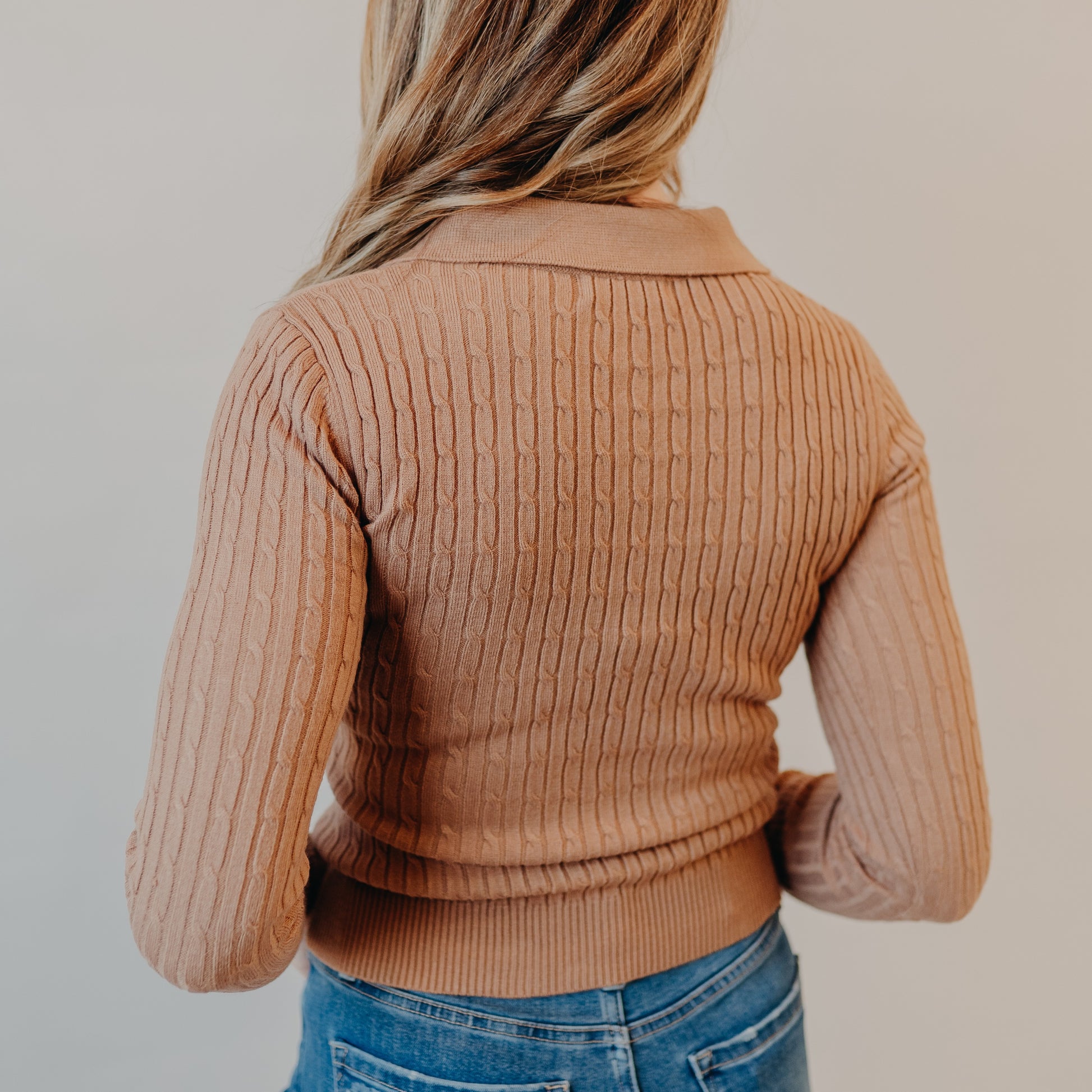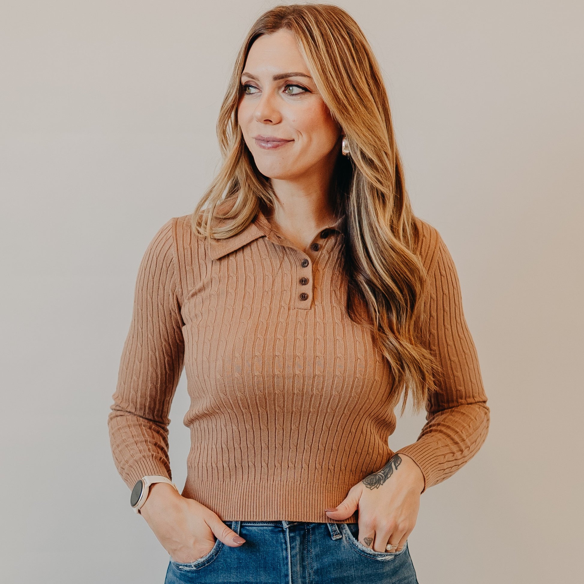 A fresh twist on a timeless favorite — this camel knit polo brings all the vintage-inspired charm with modern polish. Designed with a slim, figure-hugging fit and subtle cable knit texture, it’s finished with a collared neckline and button detail for that preppy-meets-chic vibe. Whether you’re layering it under a blazer for work or pairing it with denim for an effortless weekend look, this top makes everyday styling feel elevated.