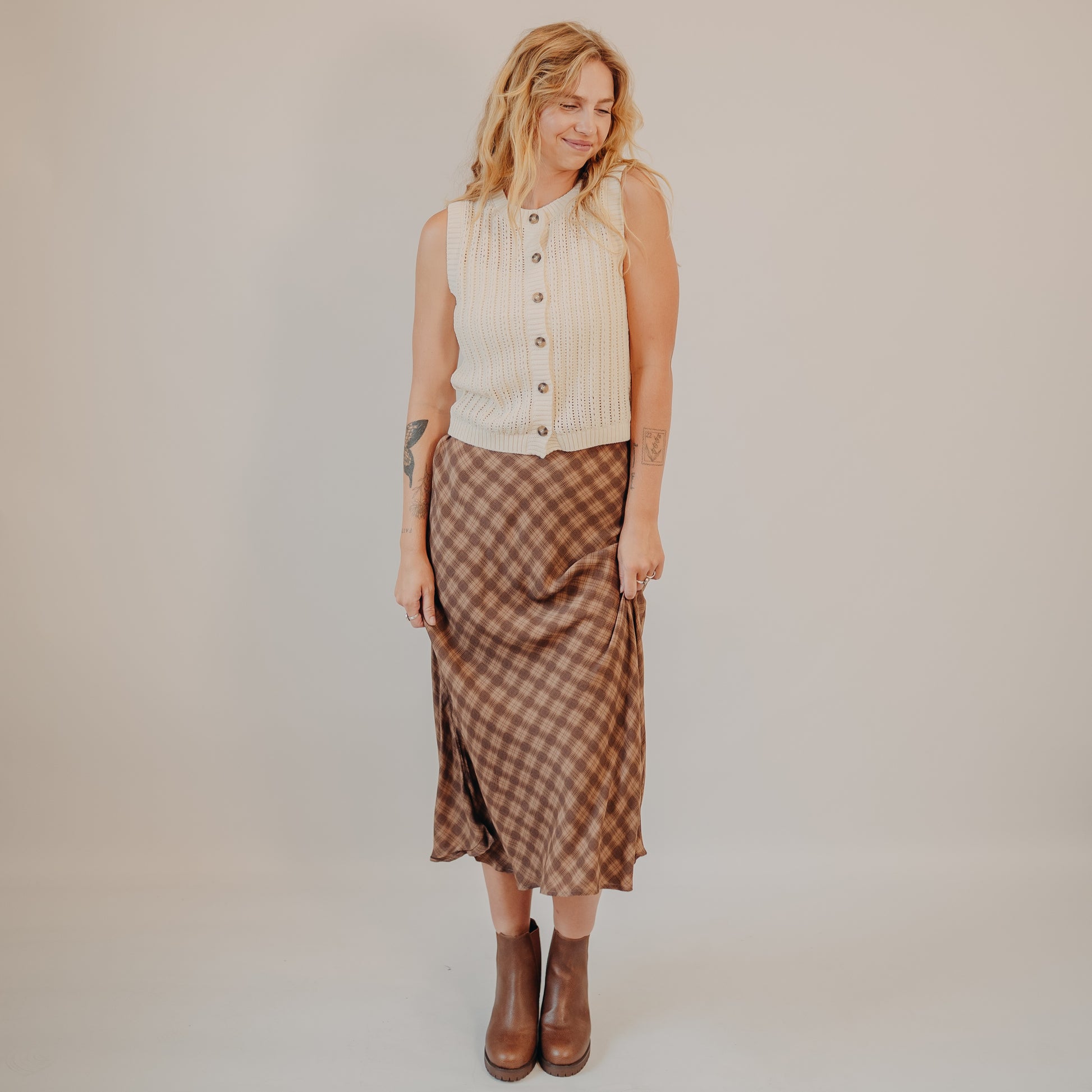 Sweet, simple, and full of texture—this button-up sweater tank is perfect for spring layering. The creamy knit and classic silhouette pair effortlessly with flowy pants, denim, or even a maxi skirt. Wear it buttoned up on its own or open over a tank for a casual layered look.