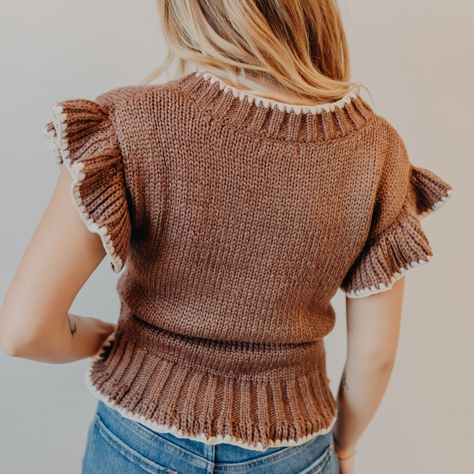 A playful twist on classic knitwear, this brown cardigan features bold ivory crochet trim along the neckline, sleeves, and hem. The flutter sleeves and textured knit add extra dimension, while the dainty crochet flower appliqués bring a sweet, vintage-inspired touch. Pair it with denim for casual days or layer it over a slip dress for a more feminine vibe.