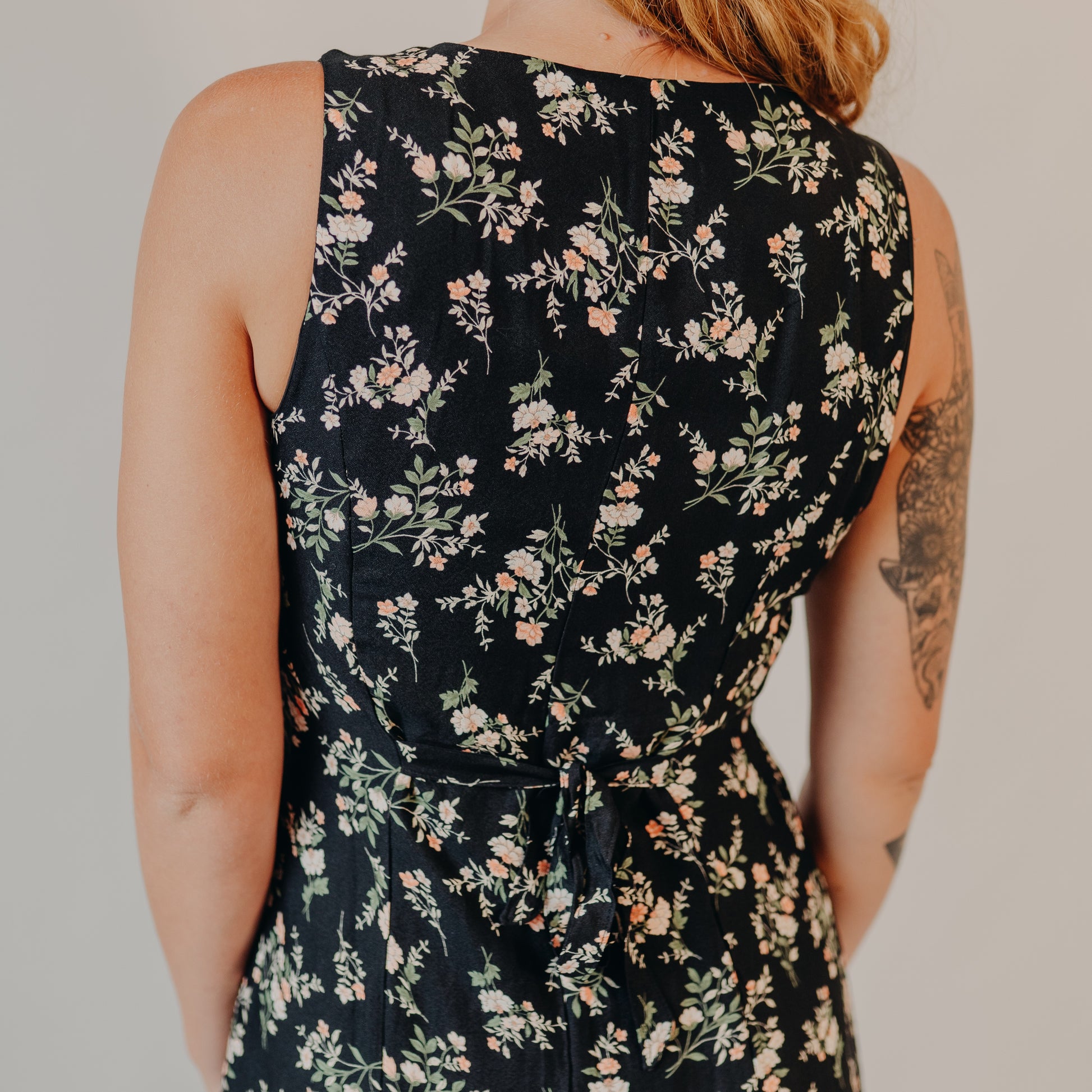 Effortlessly feminine and timeless, this black midi dress features a delicate floral print with soft blush and green tones. Designed with a flattering scoop neckline, full button-front detail, and an adjustable waist tie in the back, it creates a figure-skimming silhouette with just the right amount of flow.