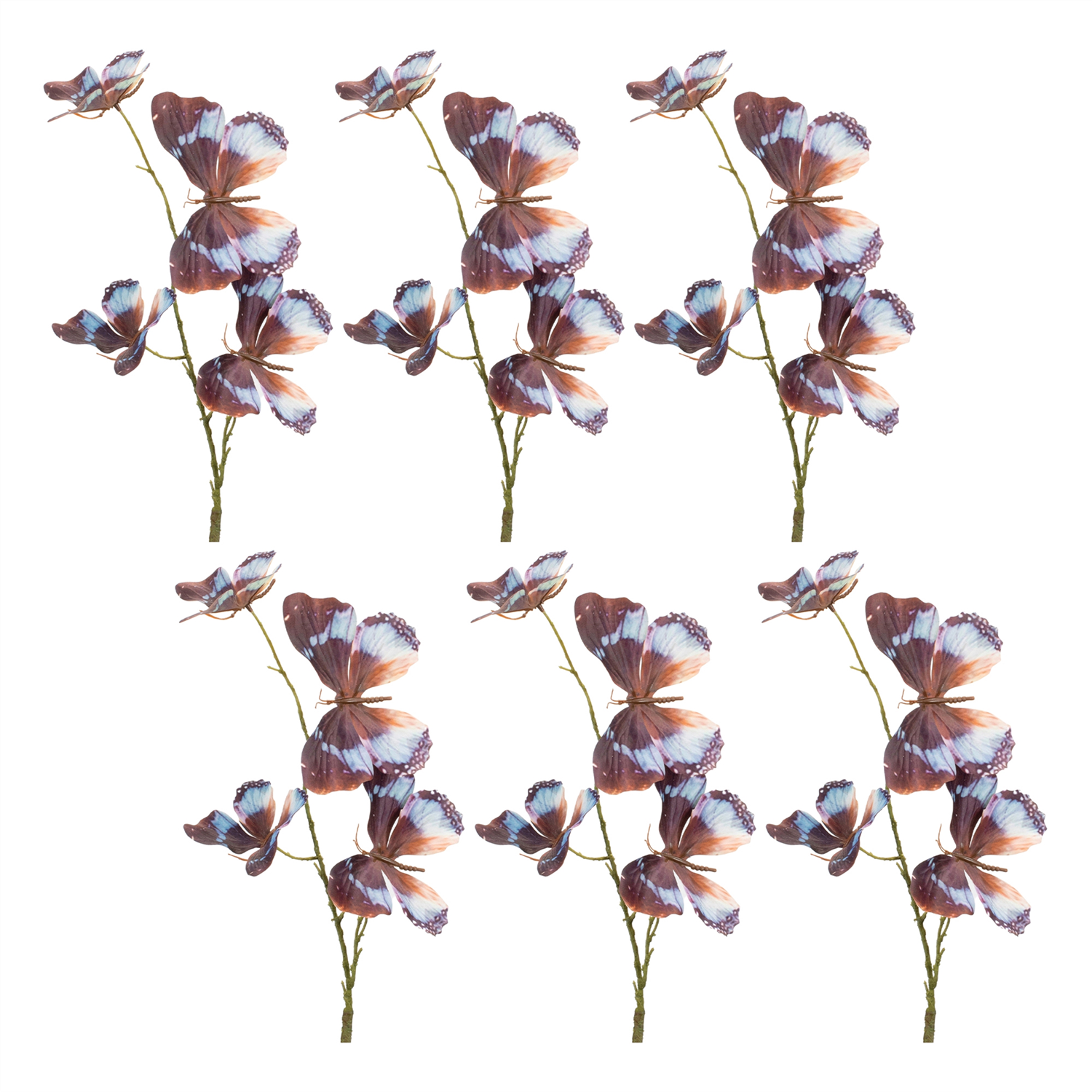 Transform your living space with the delicate beauty of our Butterfly Spray set. This stunning collection of faux stems, crafted from durable plastic, polyester, and iron wire, brings a natural and vibrant touch to any room. Featuring earthy blue and brown tones, these sprays are perfect for adding a pop of color to floral arrangements, vases, or wall baskets. Enhance your home with nature-inspired elegance and enjoy these lifelike stems for years to come. Sold in a set of six matching pieces to make a statement in your floral vases or arrangements.