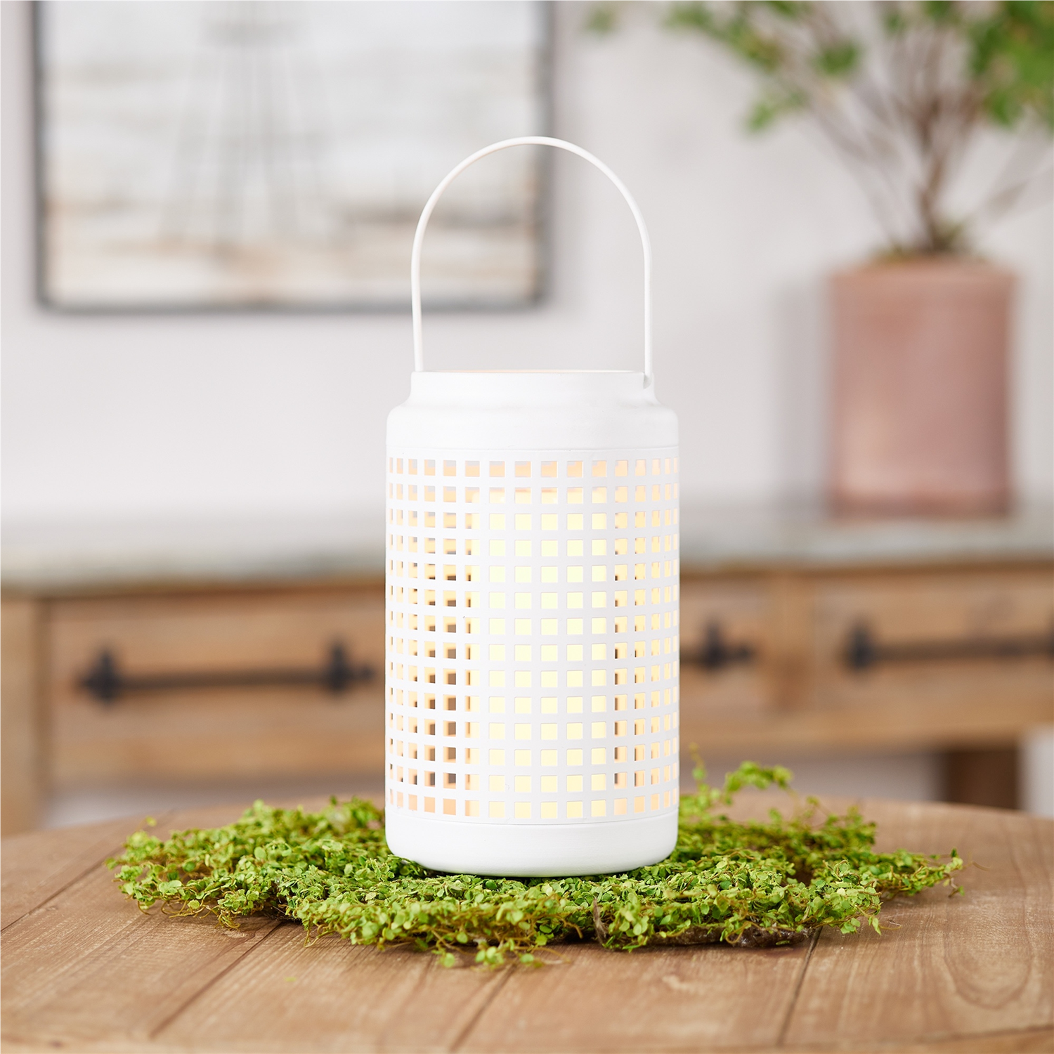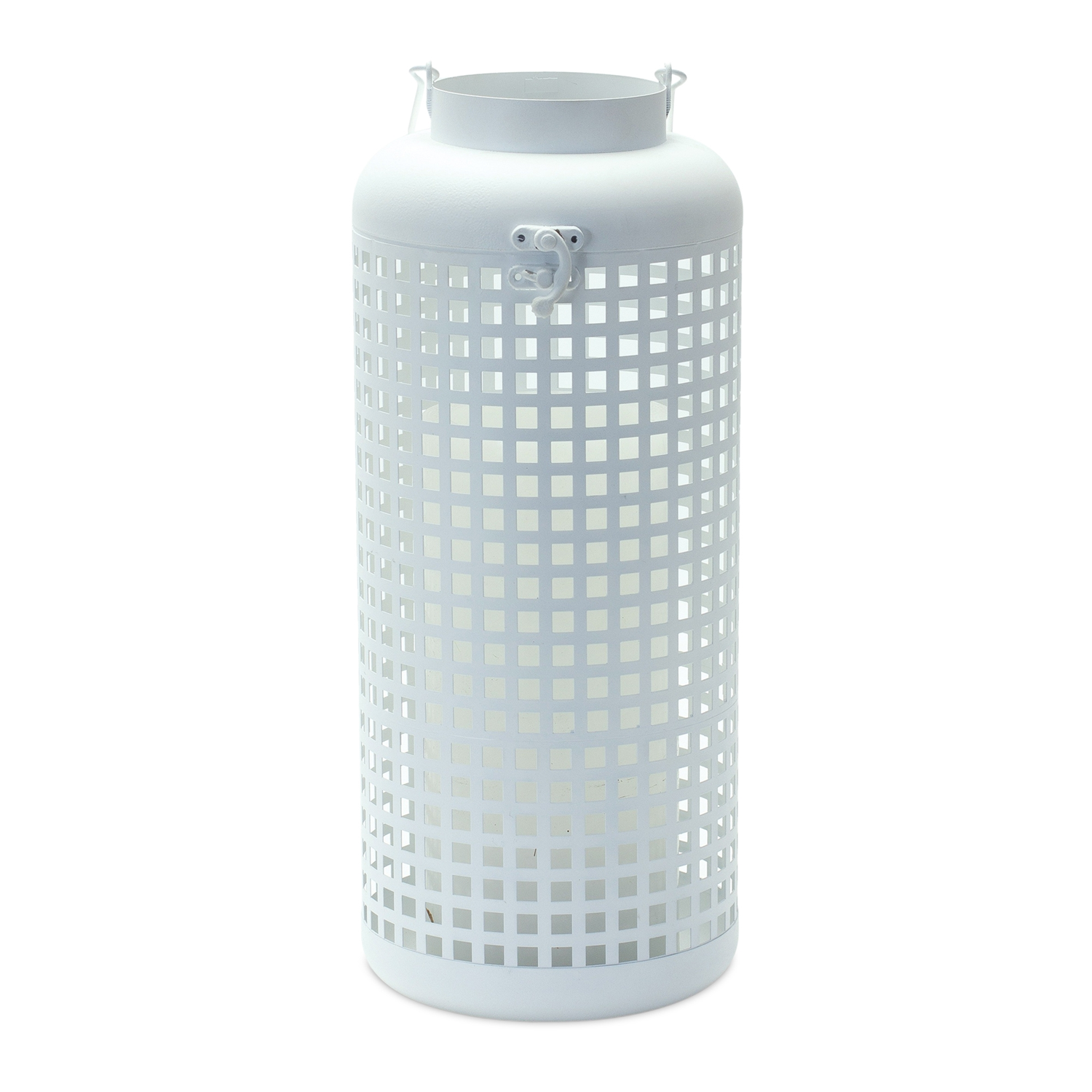 Brighten any space with this elegant White Punched Metal Candle Holder. Crafted from durable iron, this lantern showcases a sleek, modern design with a punched square pattern that casts a soft, inviting glow. Whether you're decorating for the seasons or enhancing your everyday ambiance, this versatile candle holder is perfect for both indoor and covered outdoor settings. Simply add your favorite candle (sold separately) to complete the look.