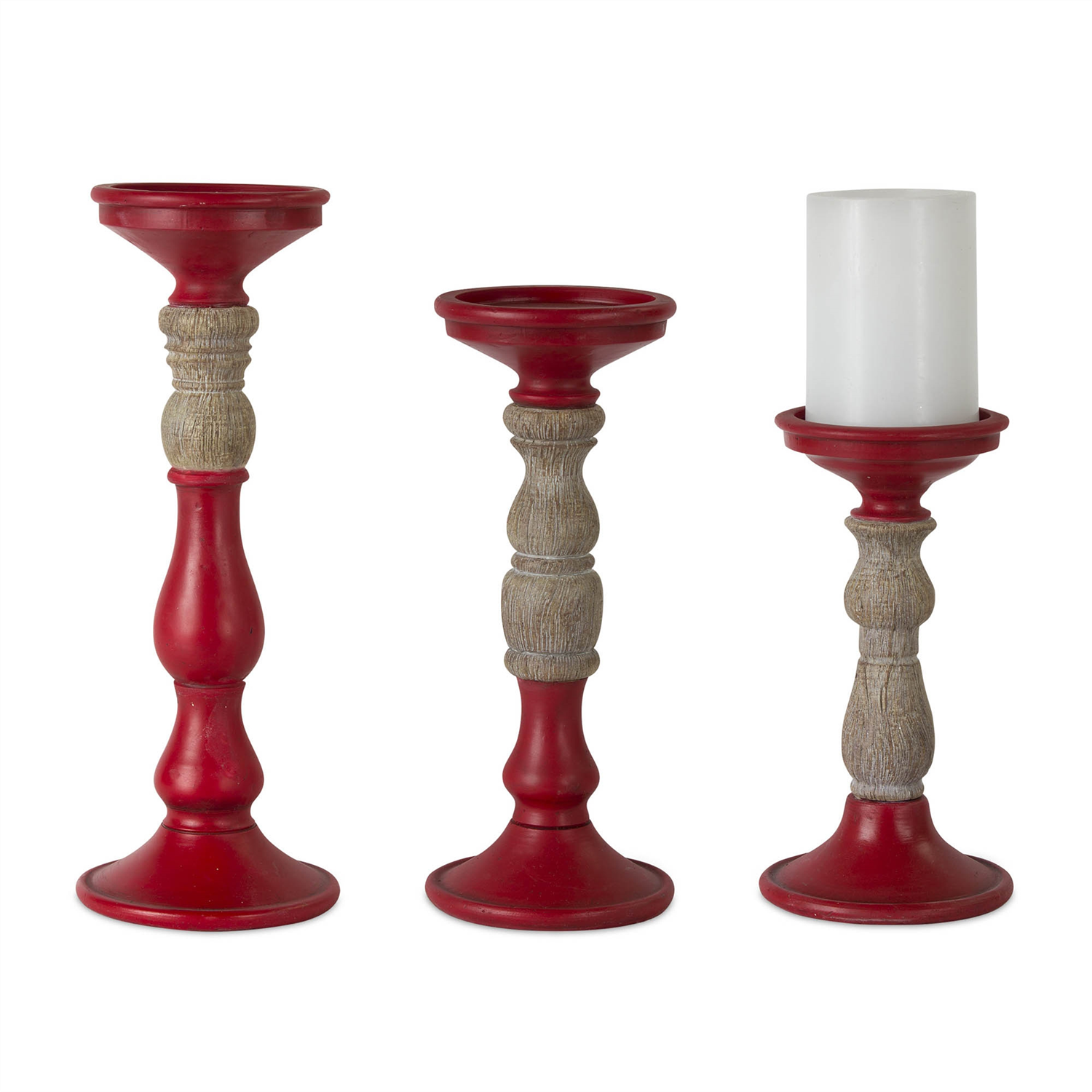 Enhance your home with the timeless charm of this Rustic Red Candle Holder Set. Featuring three candle stands in varying heights, the bold red finish combined with faux-wood accents creates a warm and inviting atmosphere. Perfect for everyday decor or seasonal displays, these versatile holders are designed to complement any setting. Add your favorite wax or LED candles to complete the look. (Candles sold separately.) Sold in a set of three assorted sizes to create a balanced display in your home.
