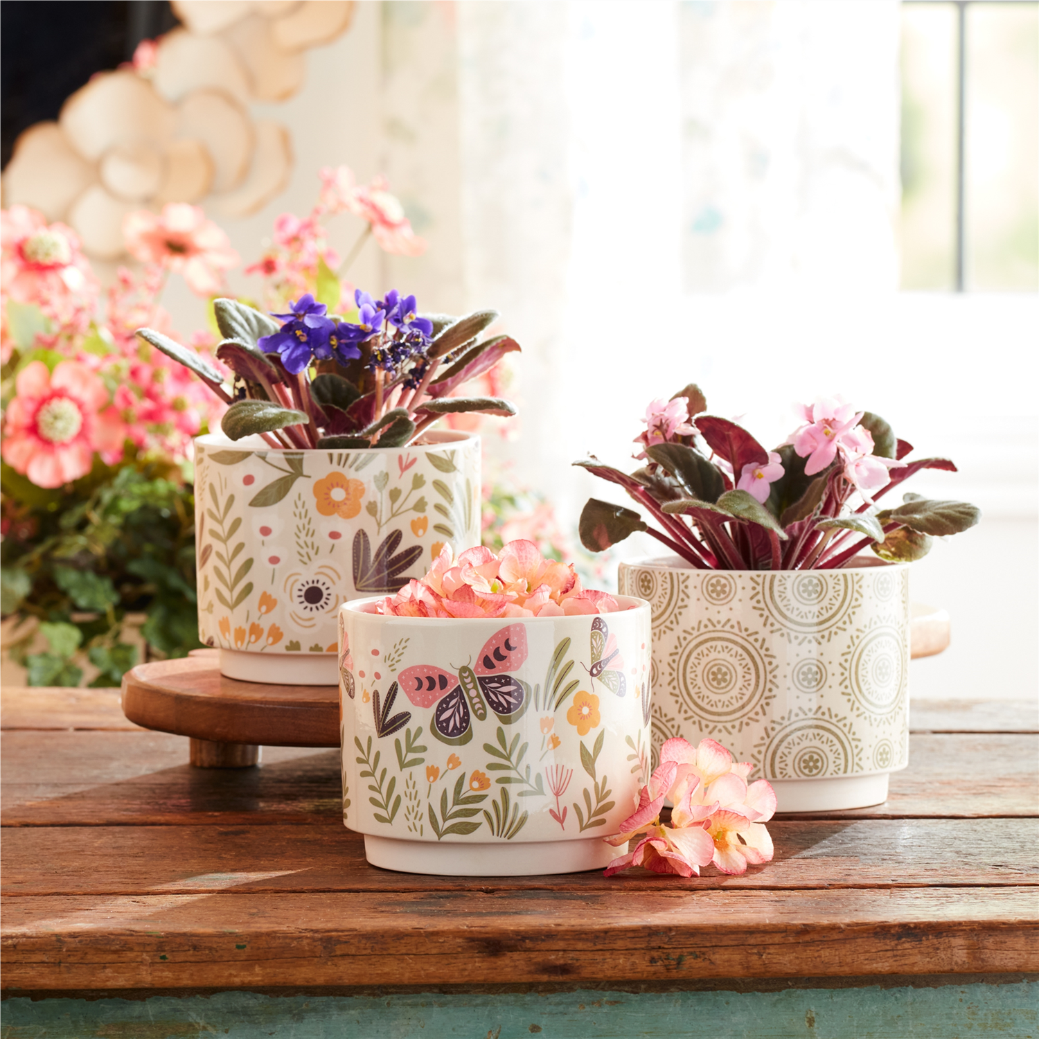 Bring vibrant color and intricate design to your space with the Stone Floral Patterned Planter Set. Featuring bright pink, green, and yellow tones, these planters are adorned with ornate floral, butterfly, and mandala patterns that add a playful yet sophisticated touch. The glazed finish enhances the beauty of the colors, and the set includes three assorted designs, giving you variety and style. These planters are ideal for real or faux plants, and suitable for both indoor and outdoor covered use.