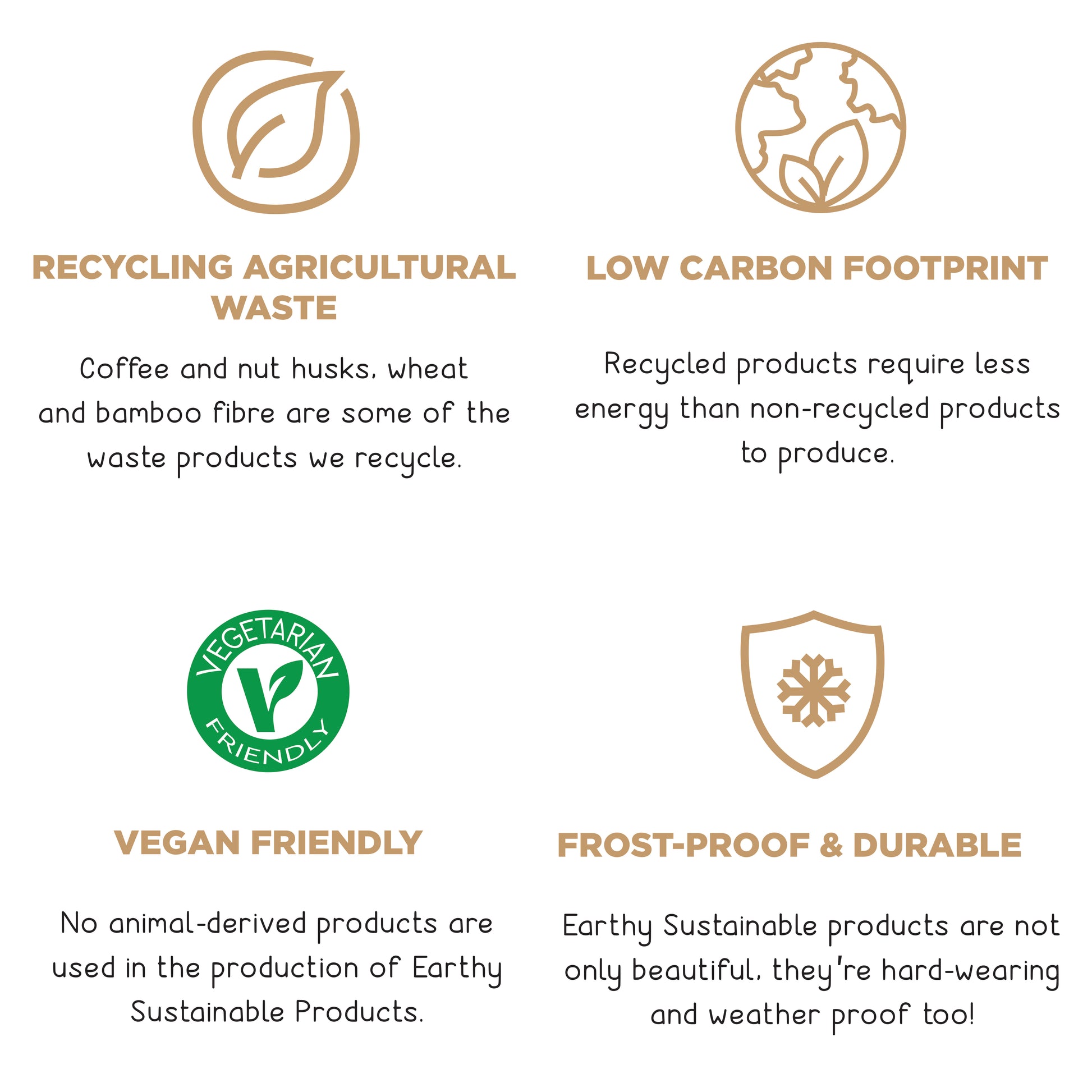 This unique Deluxe Round Bird Feeder is made with Coffee Husks. The Earthy Sustainable line processes agricultural waste blending it with resin. A lot of time energy and water goes into growing crops yet most of the plant goes unwanted and would normally be burnt releasing harmful CO2 into the environment. Instead the waste material is processed to create Earthy sustainable products. None of the ingredients are grown specifically for Earthy. The unwanted parts of commercially-farmed crops are used to make our feeders. These products are frost proof and suitable for outdoor and indoor use. Lifespan 2-3 years. Dimensions are 8.6" dia x 7.5"H.