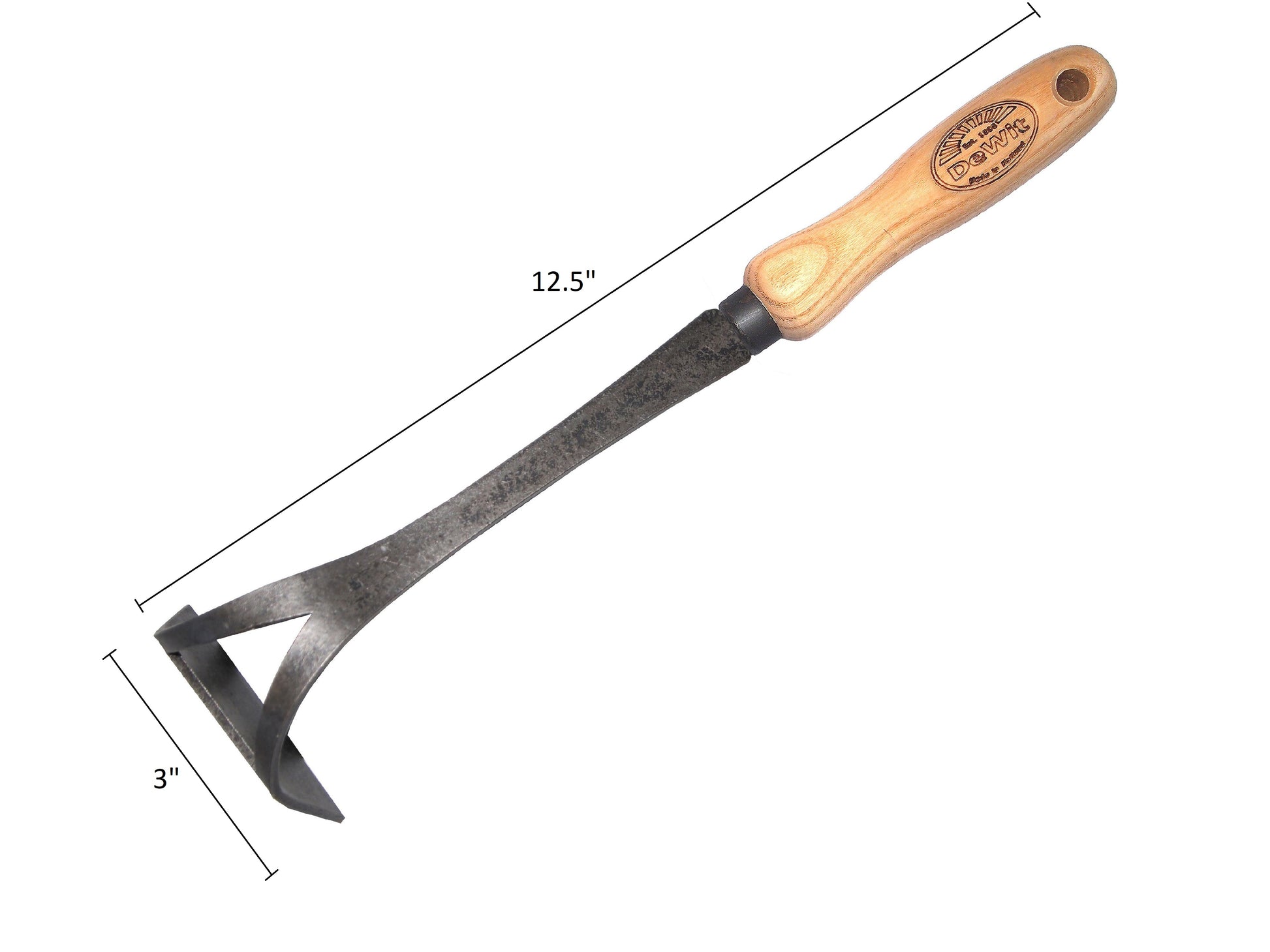 More than a tool it's an heirloom! Contemporary design this Bio Onion Hoe has a sharpened blade to make quick work of removing weeds under the surface. Made from one piece of hardened boron stamped steel with an ash hardwood handle. Great for getting into small hard-to-reach places. Ideal lightweight chopping hoe. This tool is guaranteed a lifetime! Head: 3"W Total: 12.5"L 0.4lbs