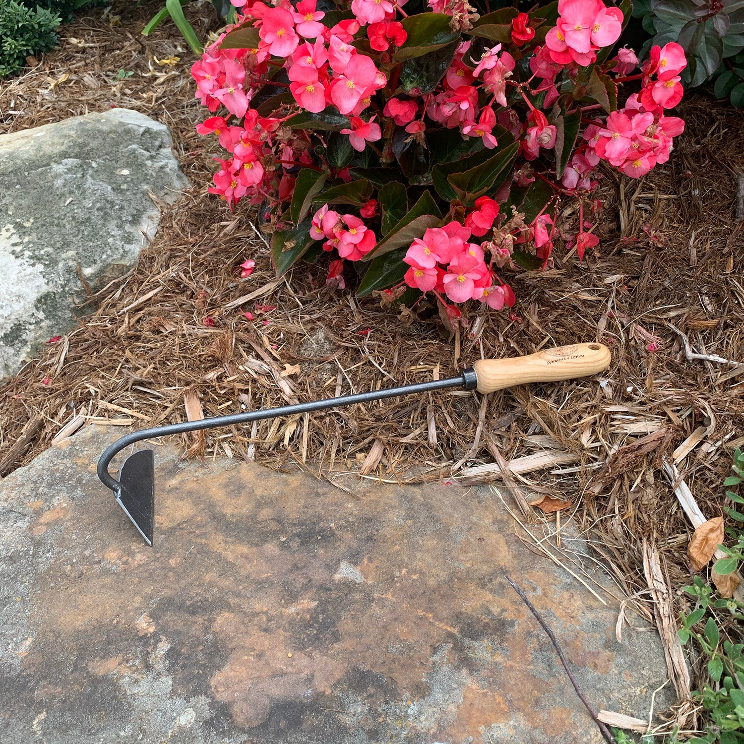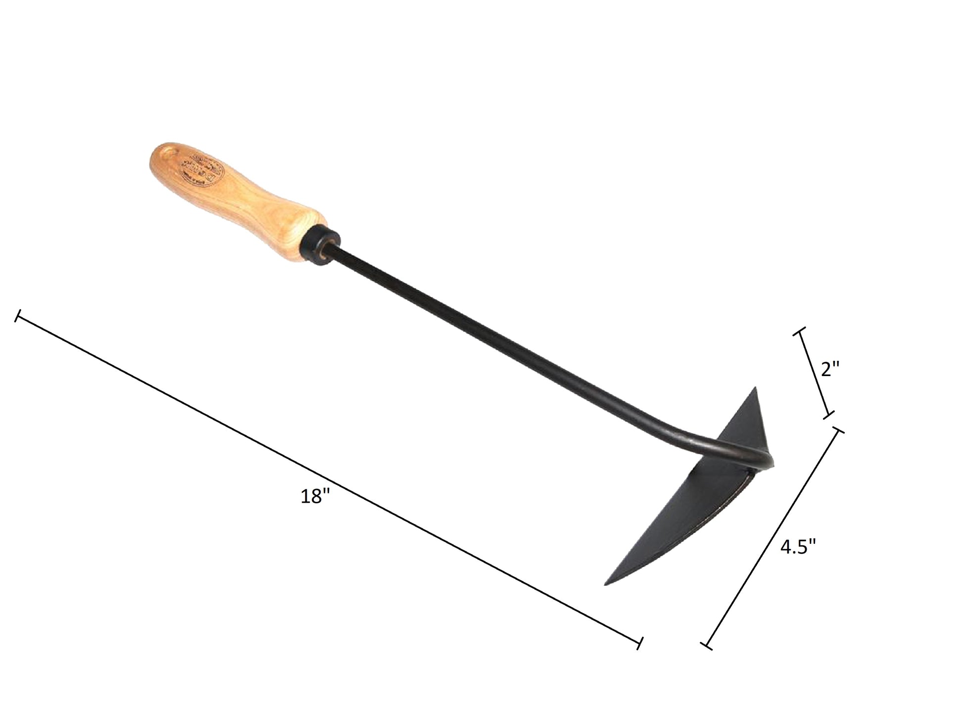 More than a tool it's an heirloom! Left Hand Dutch Hand Hoe slices weeds beneath the surface of small and dense flower and vegetable beds. Sharp crescent shaped blade is offset for greater control and balance. Constructed of forged boron steel with ash hardwood handle. Makes gardening chores quick and easy. This tool is guaranteed a lifetime! Head: 2"L x 4.5"W Total: 18"L 0.62lbs