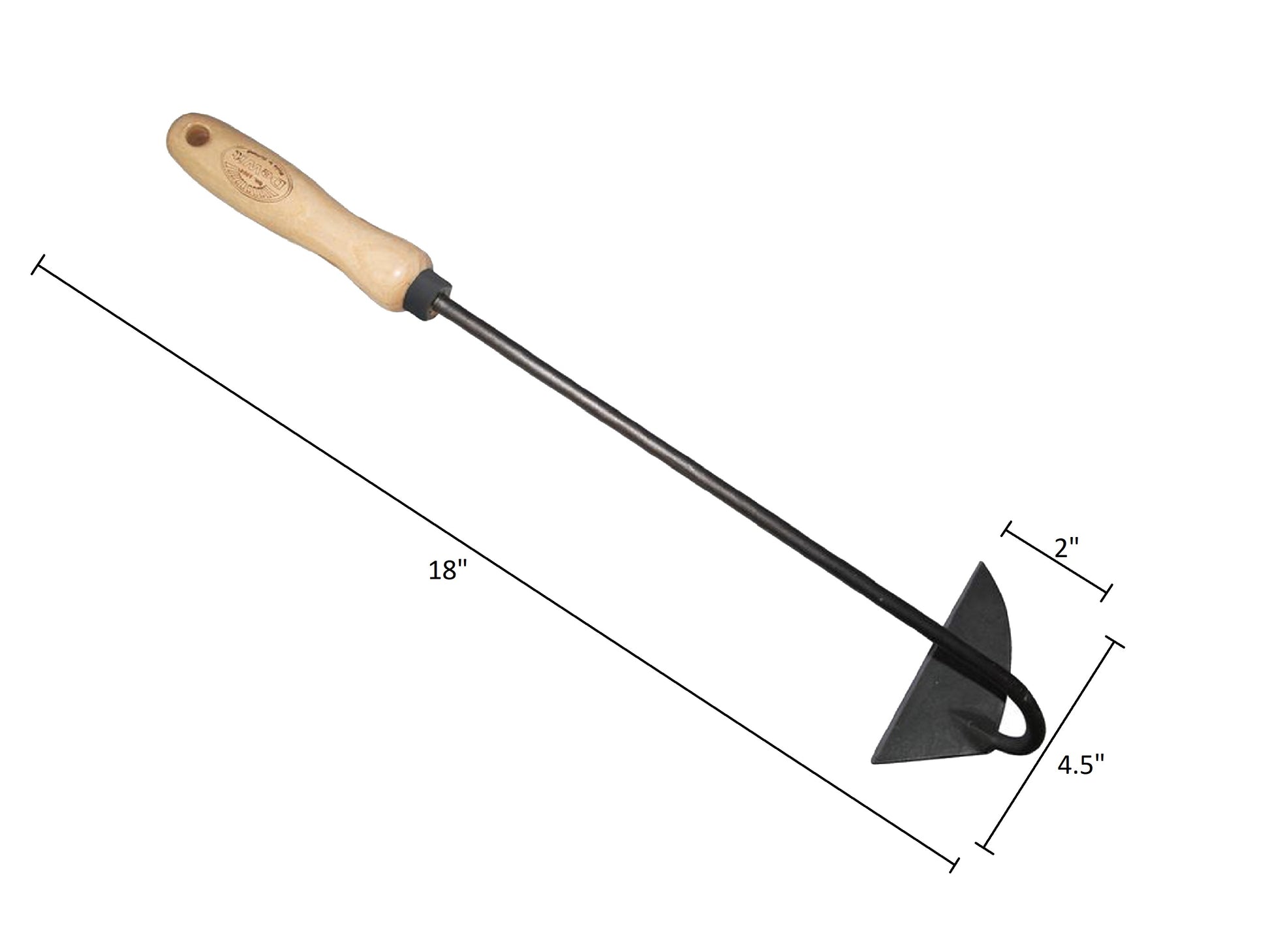 More than a tool it's an heirloom! Right Hand Dutch Hand Hoe slices weeds beneath the surface of small and dense flower and vegetable beds. Sharp crescent shaped blade is offset for greater control and balance. Constructed of forged boron steel with ash hardwood handle. Makes gardening chores quick and easy. This tool is guaranteed a lifetime! Head: 2"L x 4.5"W Total: 18"L 0.62lbs