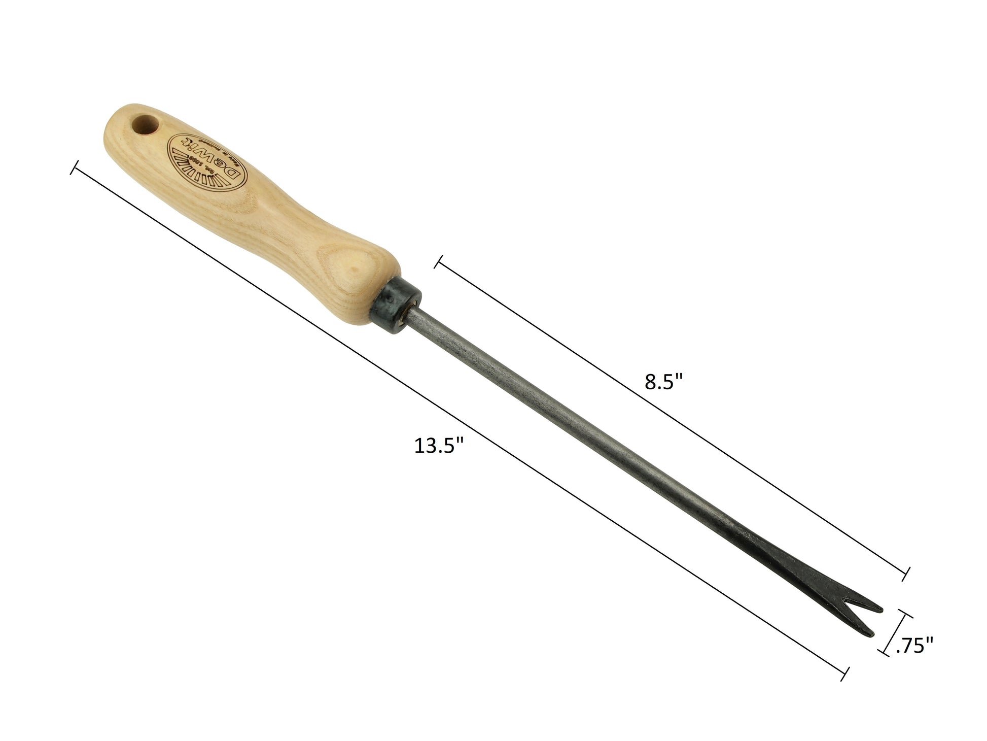 More than a tool it's an heirloom! Dandelion Weeder great for popping up weeds especially dandelions. Constructed of tempered boron steel and ash hardwood handle. Perfect tool for the eco-conscious no need for toxic herbicides. This tool is guaranteed a lifetime! Head: 8.5"L x .75"W Total: 13.5"L 0.5lbs