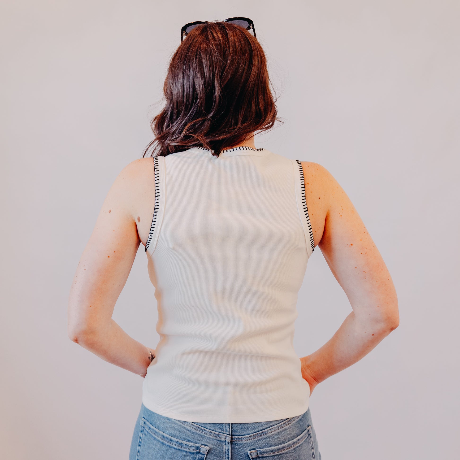 Add a little edge to your basics with this cream ribbed tank, finished with bold black contrast stitching along the neckline and armholes. The fitted silhouette and high neckline give it a modern feel, perfect for layering or wearing on its own. Pair it with light denim and slides for a fresh, easygoing outfit you’ll reach for on repeat.