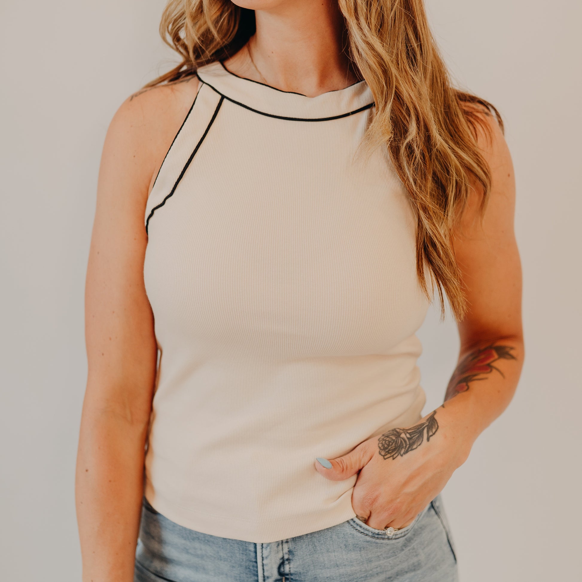 A chic twist on a wardrobe basic, this cream sleeveless top stands out with its sleek black contrast stitching. The high neckline and racerback-inspired cut give it a flattering, modern fit while keeping it versatile enough to layer or wear on its own.