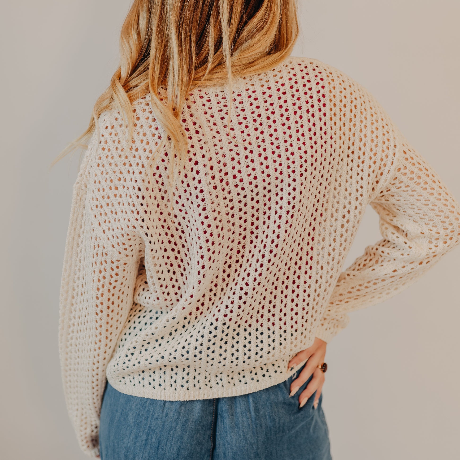 A lightweight layer that’s perfect for in-between seasons, this open-knit sweater brings a breezy yet cozy vibe to your wardrobe. Designed with a relaxed fit, dropped shoulders, and a flattering v-neckline, it’s easy to style over a tank or bralette. The ivory knit features an airy, perforated texture that adds dimension while keeping it breathable.