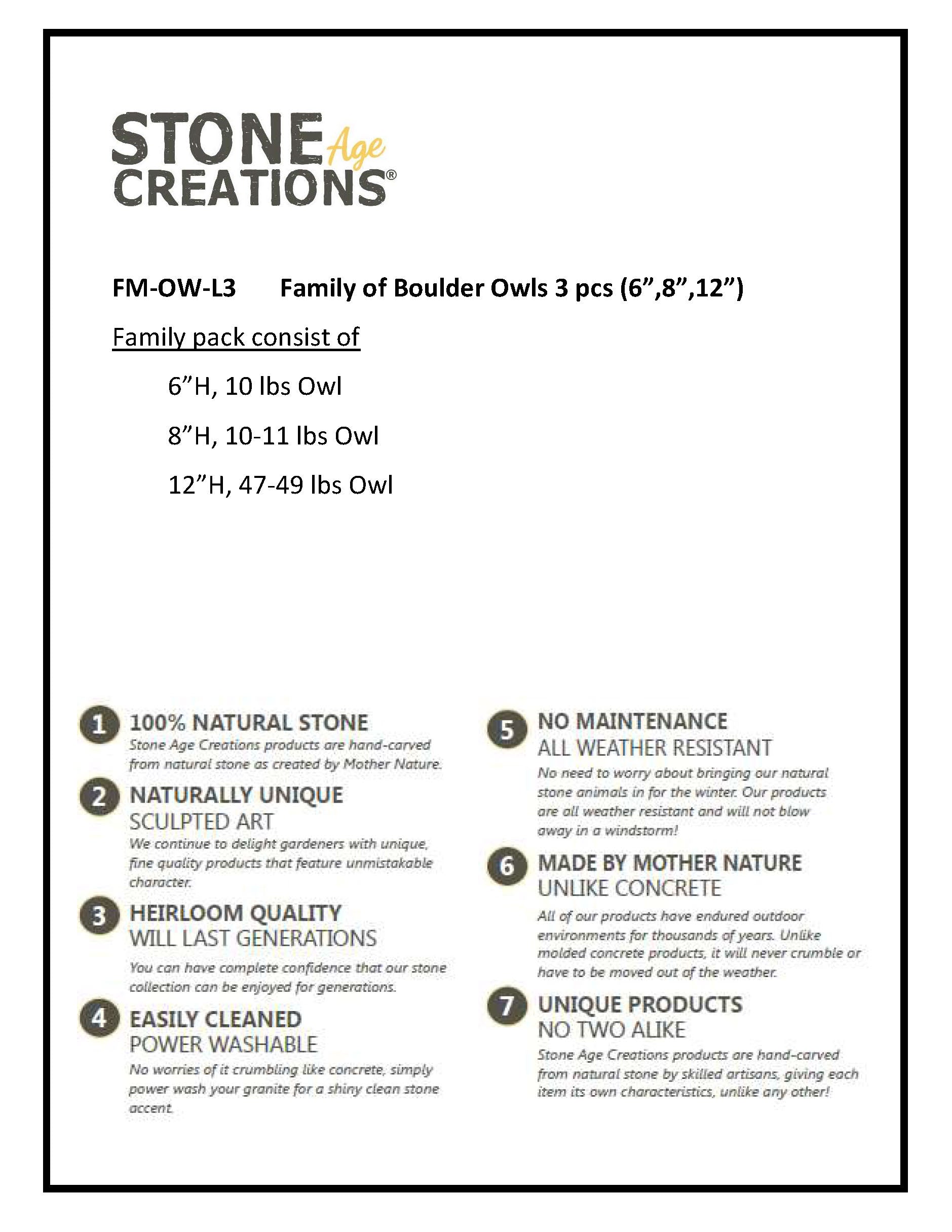This adorable Family of Boulder Owls would be a great addition around your garden or in your home. They also make perfect gifts! They are made from Natural Granite Boulder with hand carved accents and smooth features. Since each boulder pet is hand carved it is unique in shape and color. This 3 piece set includes a 6" 8-9lb 8" 10-11lb & 12" 47-49lb Boulder Owl. Height and weight are approximate.