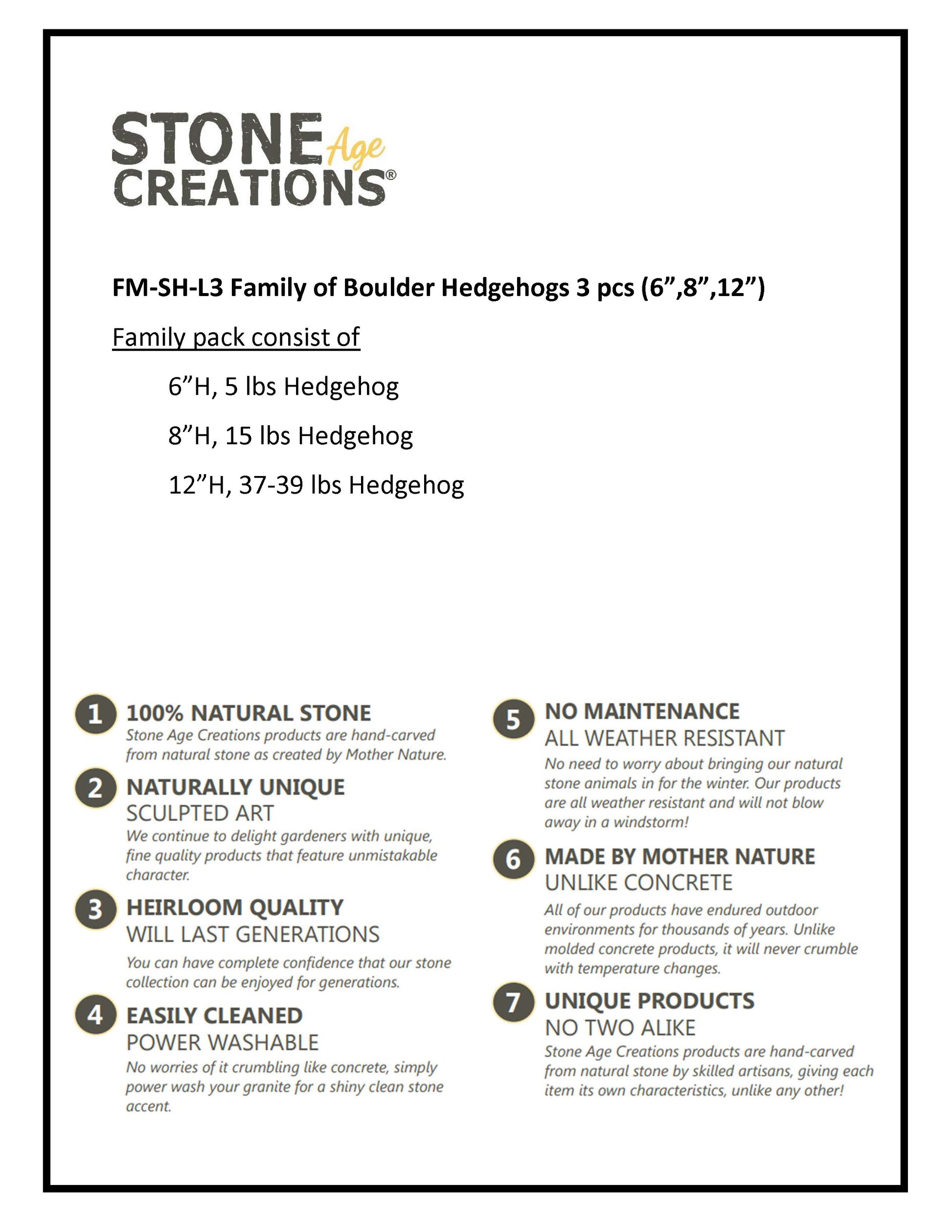 This adorable Family of Boulder Hedgehogs would be a great addition around your garden or in your home. They also make perfect gifts! They are made from Natural Granite Boulder with hand carved details that make each hedgehog one-of-a-kind. Since each boulder pet is hand carved it is unique in shape and color. This 3 piece set includes a 6" 3-4lb 8" 15-17lb & 12" 37-39lb Boulder Hedgehog. Height and weight are approximate.