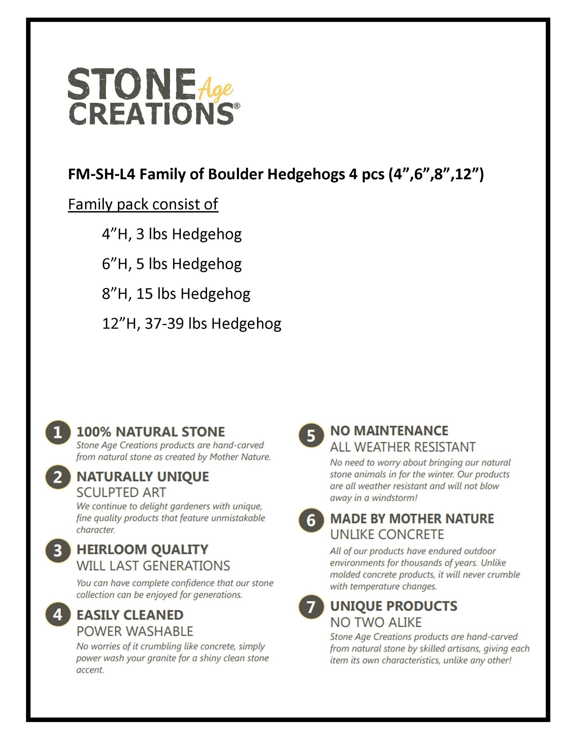 This adorable Family of Boulder Hedgehogs would be a great addition around your garden or in your home. They also make perfect gifts! They are made from Natural Granite Boulder with hand carved details that make each hedgehog one-of-a-kind. Since each boulder pet is hand carved it is unique in shape and color. This 4 piece set includes a 4" 1-2lb 6" 3-4lb 8" 15-17lb & 12" 37-39lb Boulder Hedgehog. Height and weight are approximate.
