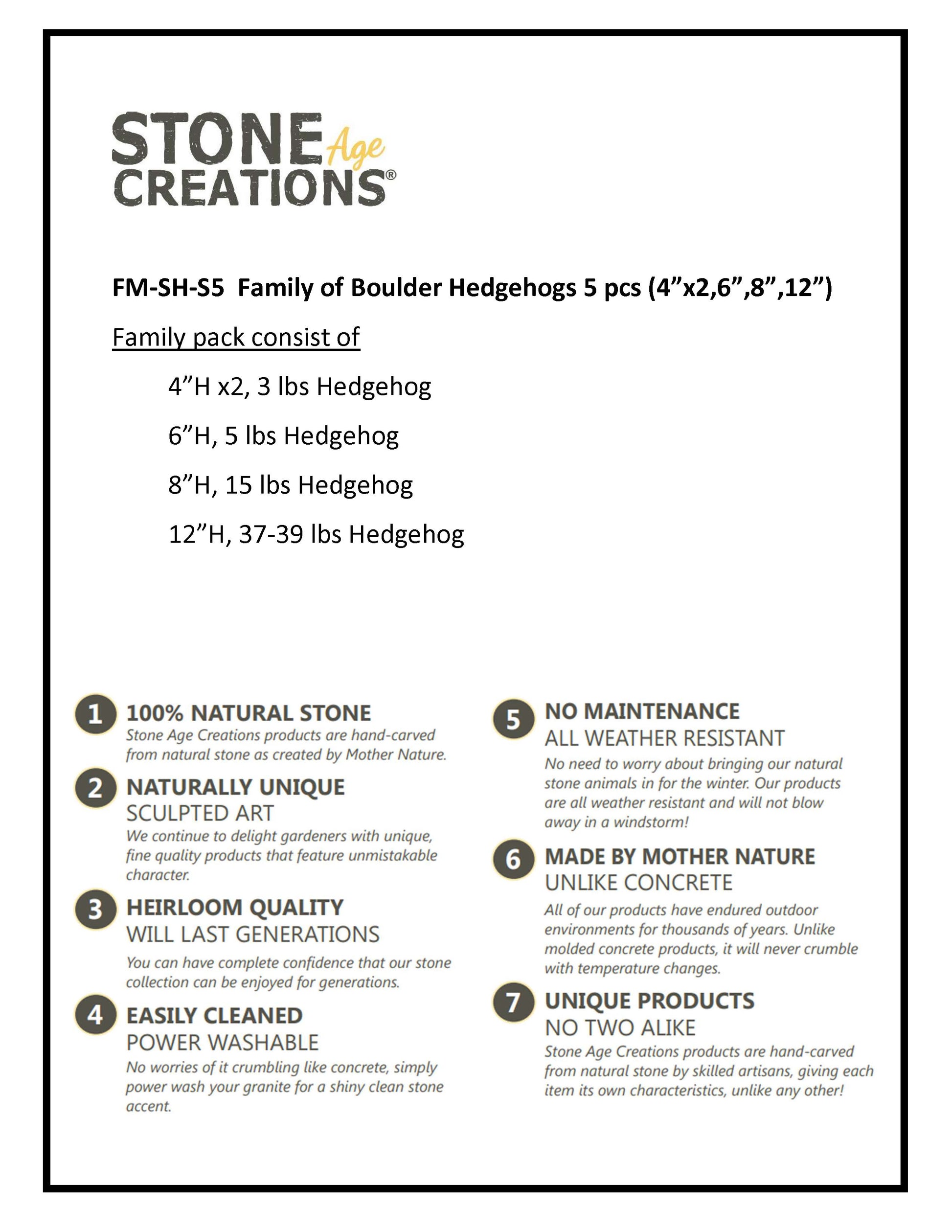 This adorable Family of Boulder Hedgehogs would be a great addition around your garden or in your home. They also make perfect gifts! They are made from Natural Granite Boulder with hand carved details that make each hedgehog one-of-a-kind. Since each boulder pet is hand carved it is unique in shape and color. This 5 piece set includes two 4" 1-2lb one 6" 3-4lb one 8" 15-17lb & one 12" 37-39lb Boulder Hedgehog. Height and weight are approximate.