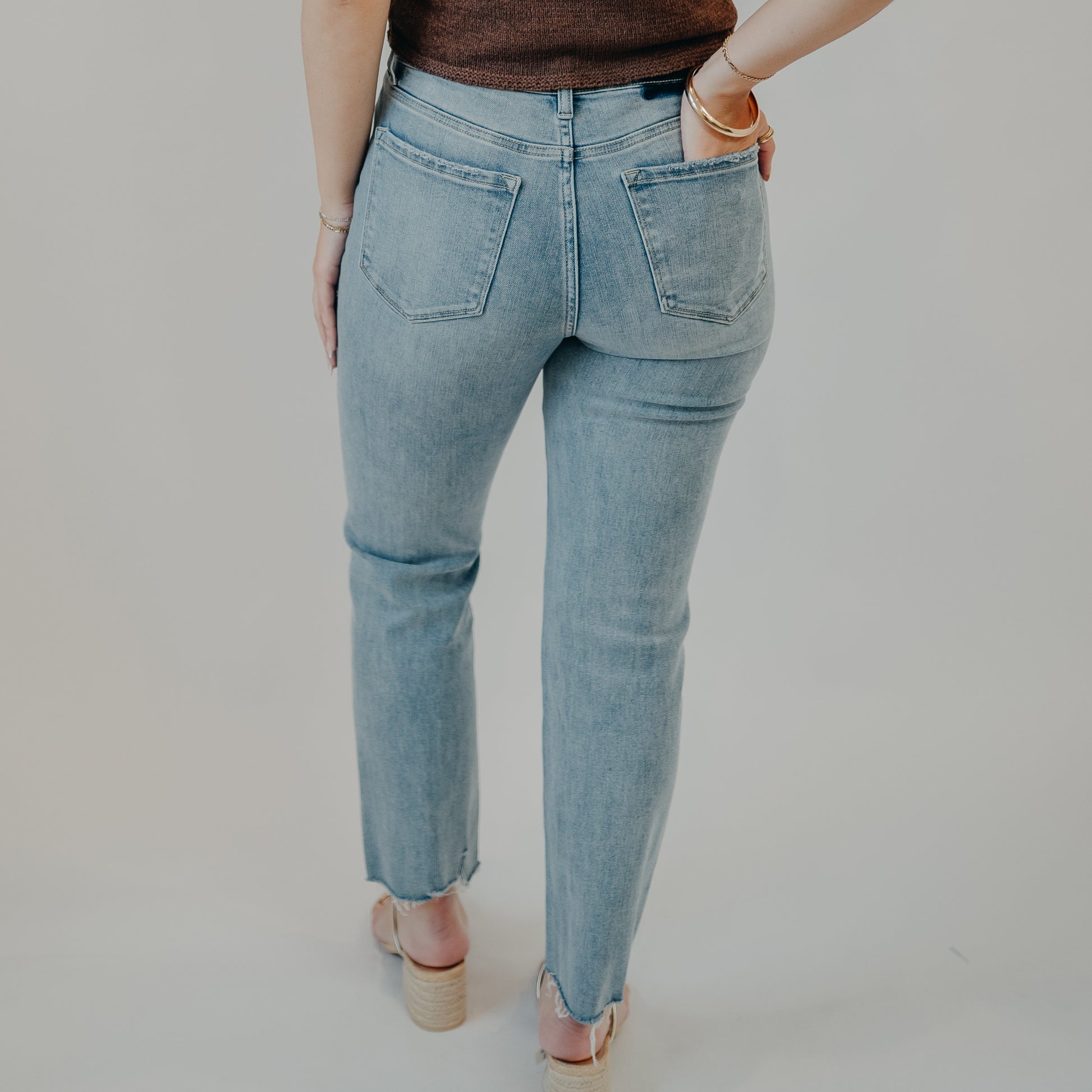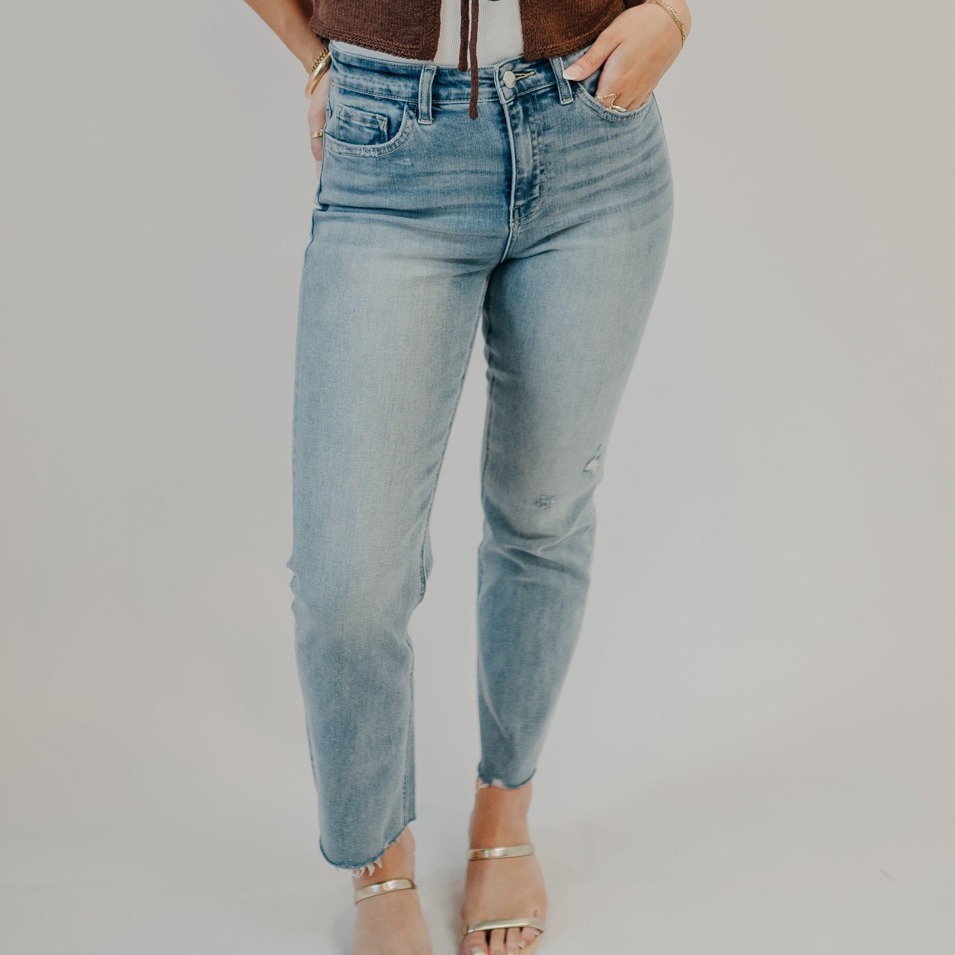 The kind of denim you’ll want to live in. These high-rise straight jeans are made with a soft, broken-in wash and hit right above the ankle with a raw hem and just a touch of distressing. Their clean silhouette makes them an easy pick for both dressed-up and casual outfits.