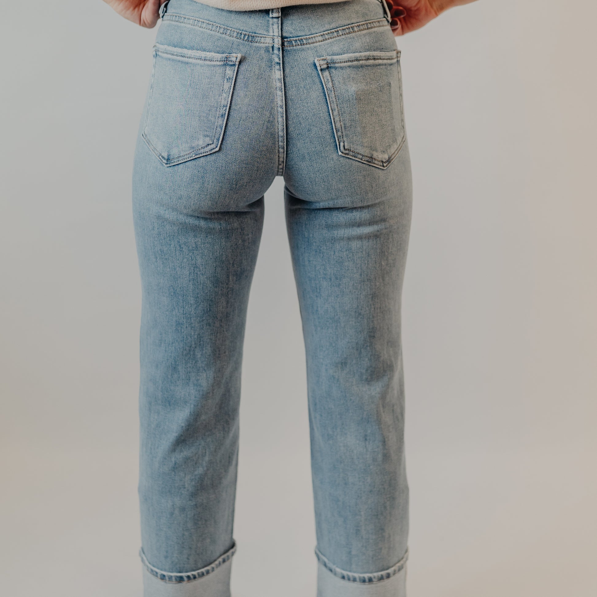 Meet your new favorite denim — a modern update to a timeless silhouette. These light wash jeans feature a flattering high-rise fit and relaxed straight leg with an exaggerated cuffed hem that adds a touch of effortless cool. Perfect for pairing with boots or sneakers, they bring that “model-off-duty” vibe to any outfit.