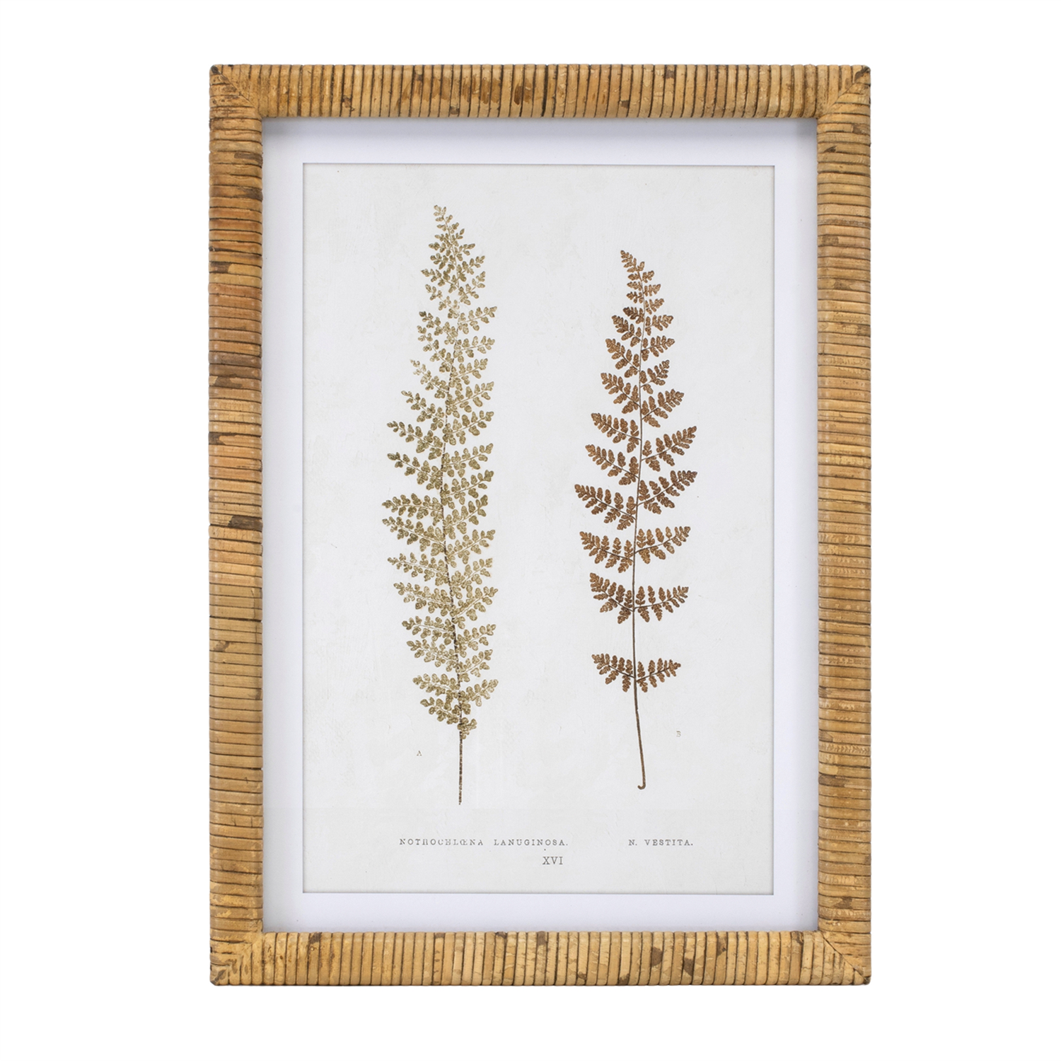 Transform your living space with the Wood Framed Fern Print Set. Perfect for a country cottage or rustic woodland-inspired decor, this set features four distinct fern designs, each beautifully showcased in natural fir wood frames wrapped in rattan. The warm beige tones and intricate encyclopedia-style artwork under glass add a timeless charm to any room. Whether displayed together as a focal point or scattered throughout your home, these prints bring nature's beauty indoors with elegance and ease. Durable materials ensure that this set will grace your walls for seasons to come. Sold in a collection of four assorted designs to create a balanced and memorable display in your home.