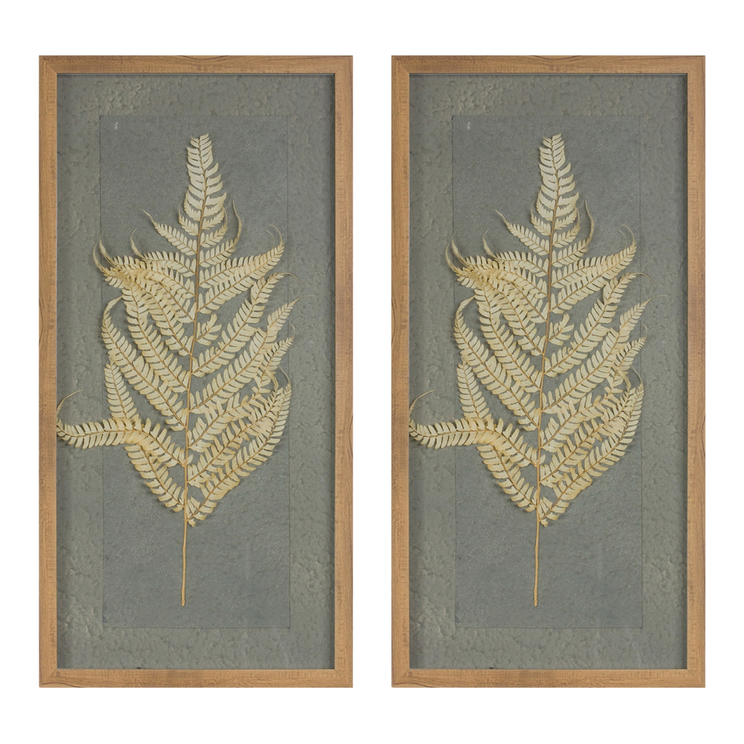 Bring the beauty of nature indoors with this stunning set of Dried Fern Frames. Featuring lifelike dried fern motifs in earthy green and beige tones, each piece is encased in a natural wood frame with a clean, contemporary design. The neutral palette and rustic charm make them a perfect fit for modern farmhouse, boho, or transitional spaces. Whether displayed in a hallway, living room, or office, these botanical prints infuse your walls with organic elegance and timeless style. Sold in a set of two assorted designs to create a balanced and memorable display in your home.
