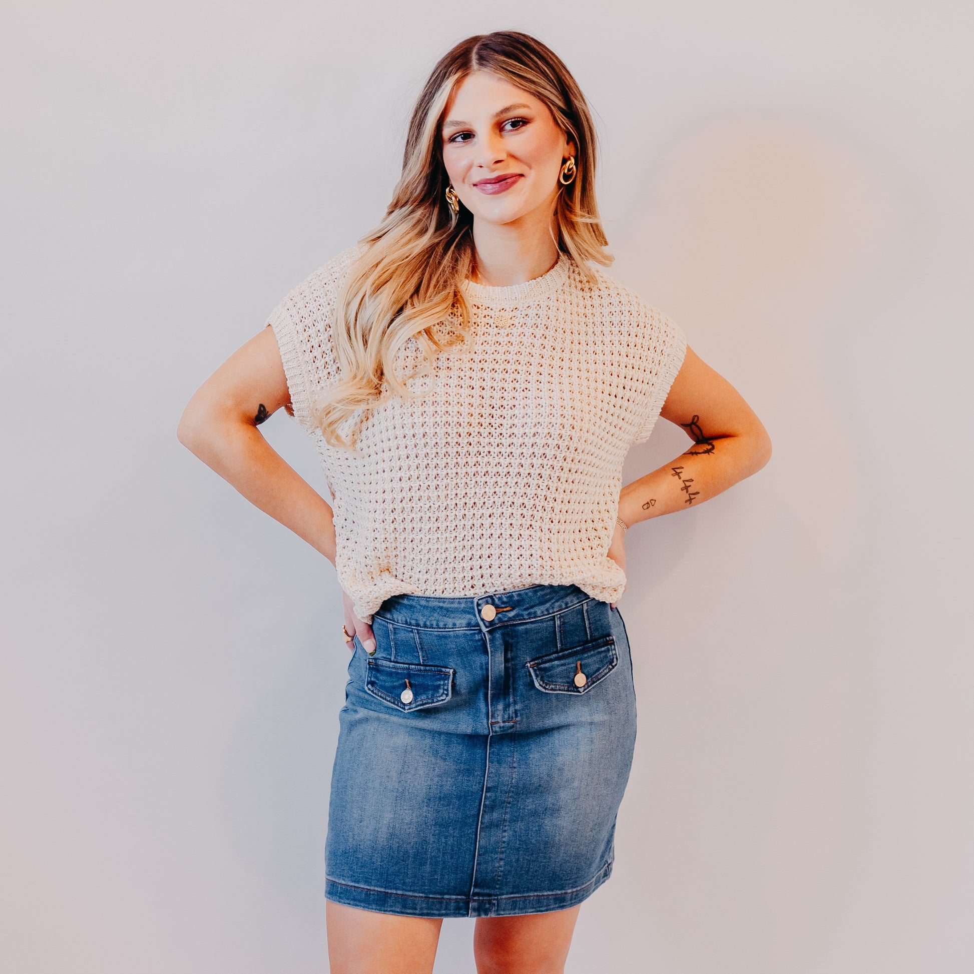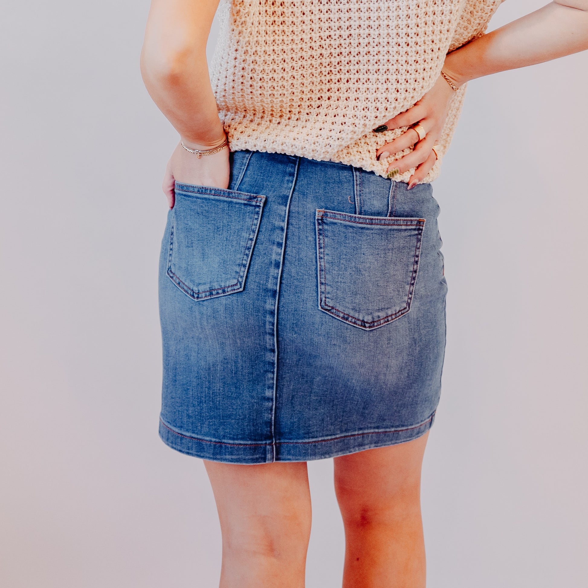 Elevate your casual denim game with this denim skirt! This flattering high-rise piece hugs just right and adds playful flair with its functional button-up front pockets. It’s a go-to for spring styling—cute with a tucked-in tee, cropped sweater, or flirty blouse.
