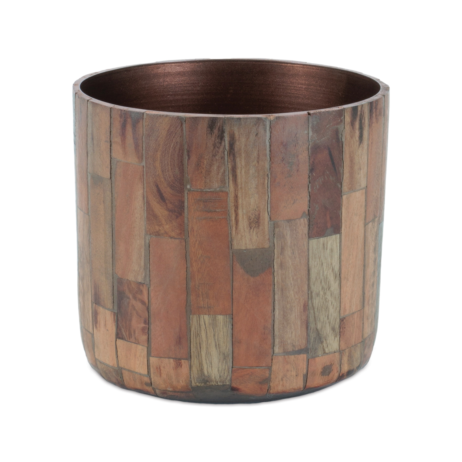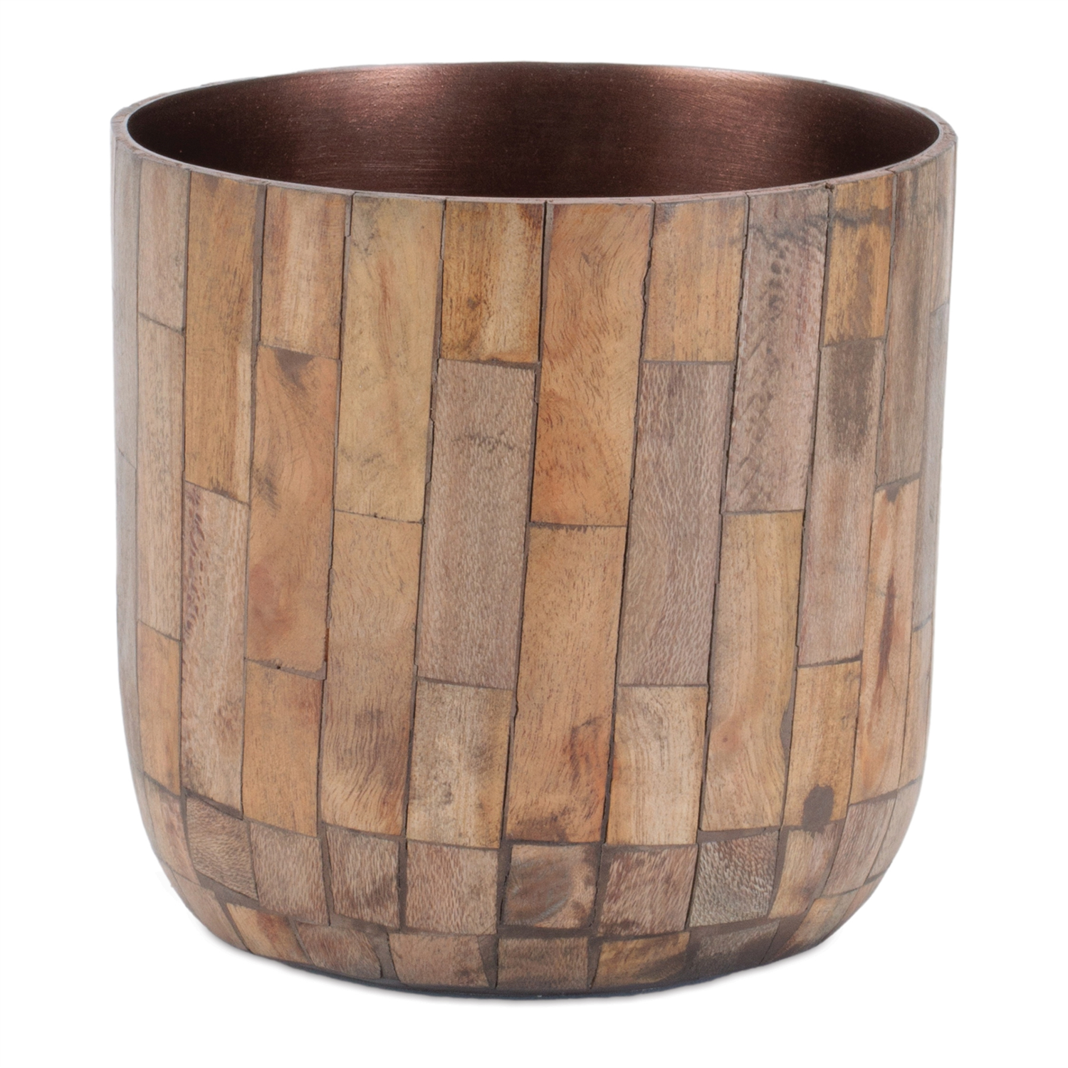 Enhance your indoor space with the Round Wooden Planter Set. Featuring natural brown tones and beautiful wood grain finishes, these planters are lined with chic bronze metal accents for a modern touch. Sold in a set of two assorted sizes, these planters are perfect for displaying real or faux plants. Ideal for indoor use, these planters add a natural, contemporary charm to your home, complementing modern and contemporary decor styles.