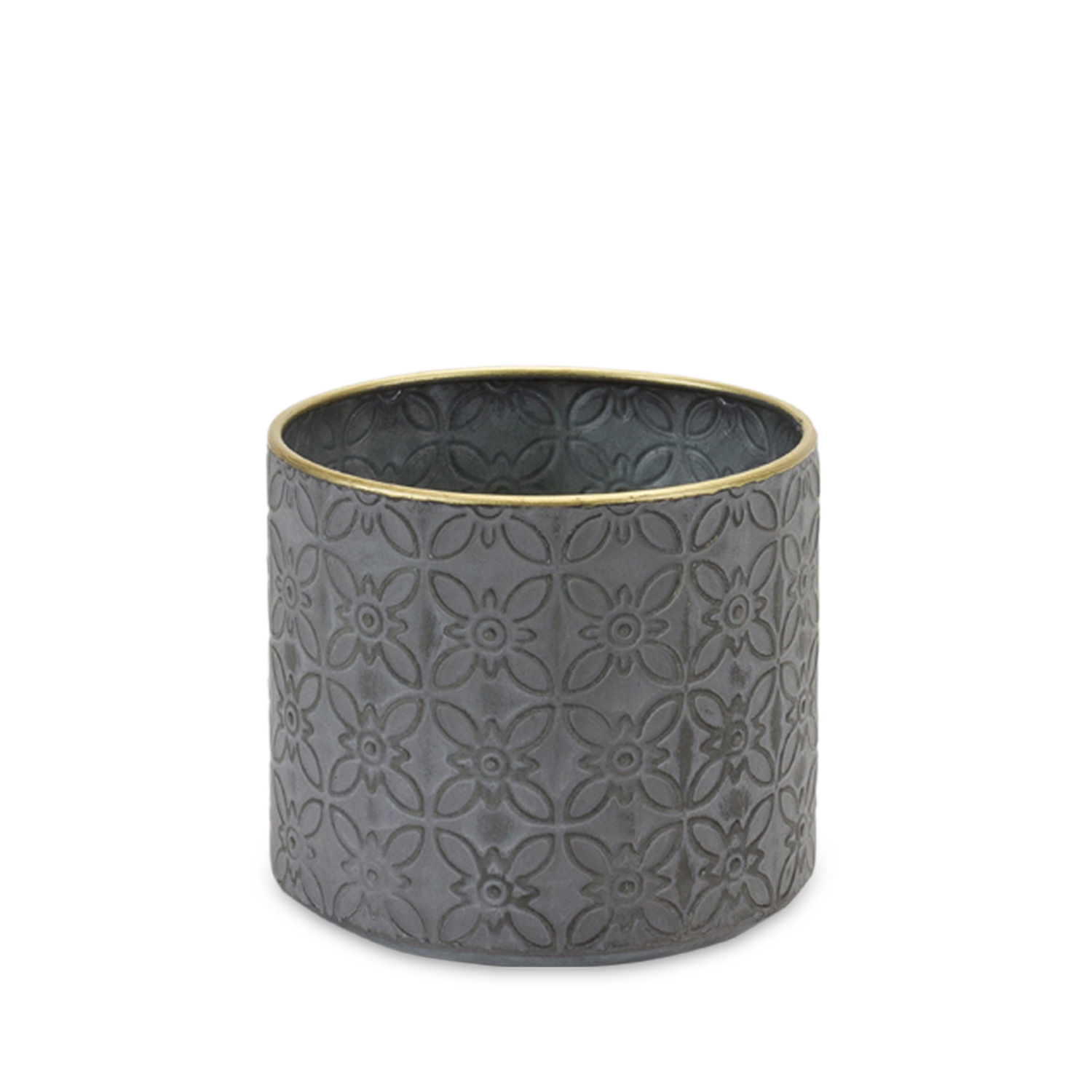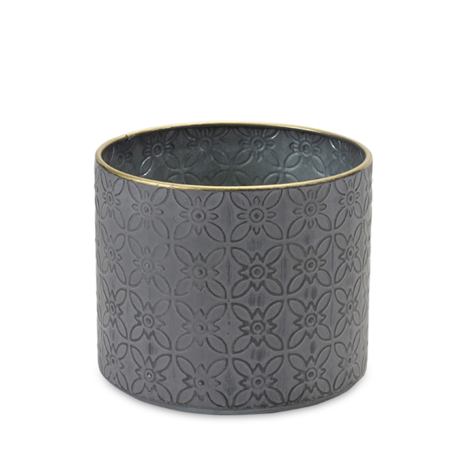 Elevate your plant display with this stunning Set of Ornate Geometric Metal Planters. Featuring a sophisticated distressed grey finish accented by elegant gold trim, each planter brings a touch of luxury to any space. The intricate geometric design and varied sizes make them ideal for showcasing your favorite faux or live plants. Whether styled in your living room, outdoor-covered patio, or sunroom, these durable metal planters add charm, texture, and refined flair to your indoor or covered outdoor decor. Sold in a set of four assorted sizes to create a balanced and memorable display in your home or patio setting.