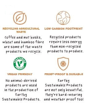 This unique Suet Cake Bird Feeder is made with Coffee Husks. The Earthy Sustainable line processes agricultural waste blending it with resin. A lot of time energy and water goes into growing crops yet most of the plant goes unwanted and would normally be burnt releasing harmful CO2 into the environment. Instead the waste material is processed to create Earthy Sustainable products. None of the ingredients are grown specifically for Earthy. The unwanted parts of commercially-farmed crops are used to make our feeders. These products are frost proof and suitable for outdoor and indoor use. Lifespan 2-3 years. Dimensions are 6.5"W x 1.9"D x 5.1"H.