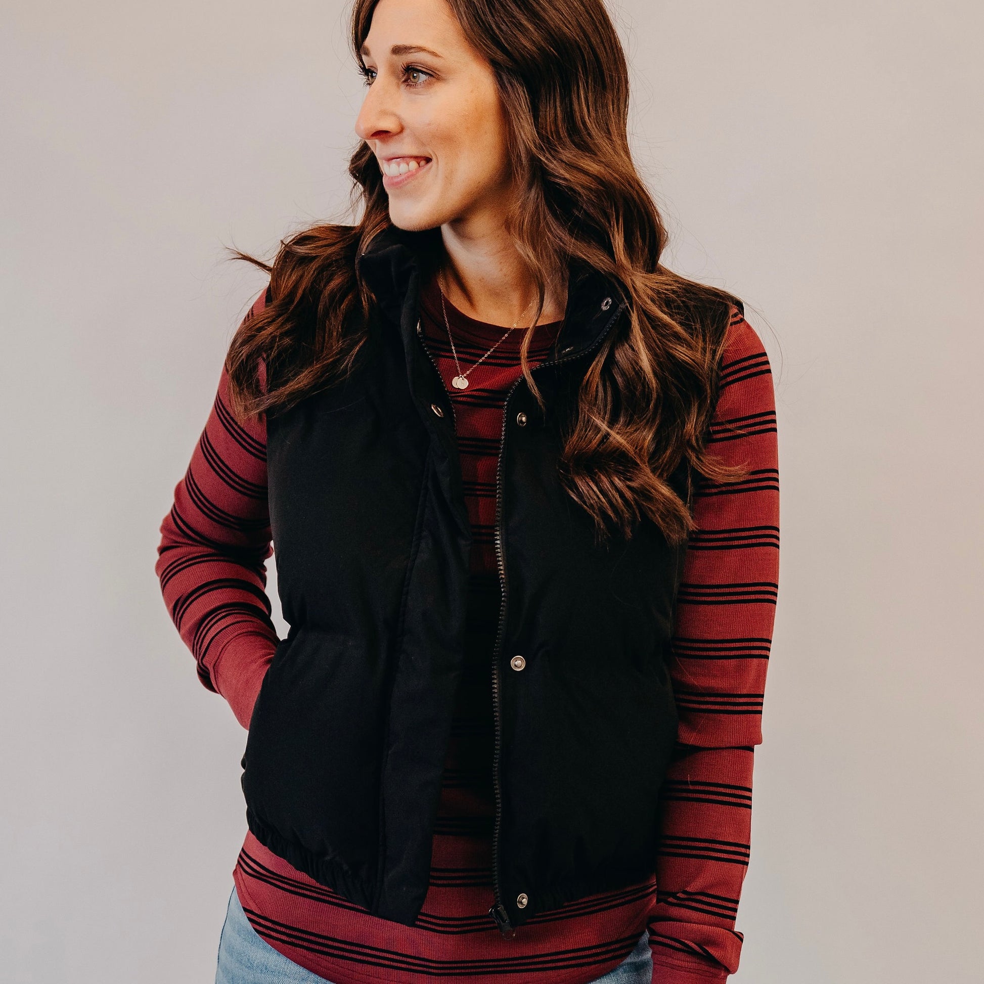 Say no more! This vest is a MUST-HAVE for winter! The darling cropped look pairs perfect with sweaters, long sleeve tees, + more! The downy-like fill creates a darling puffed look!