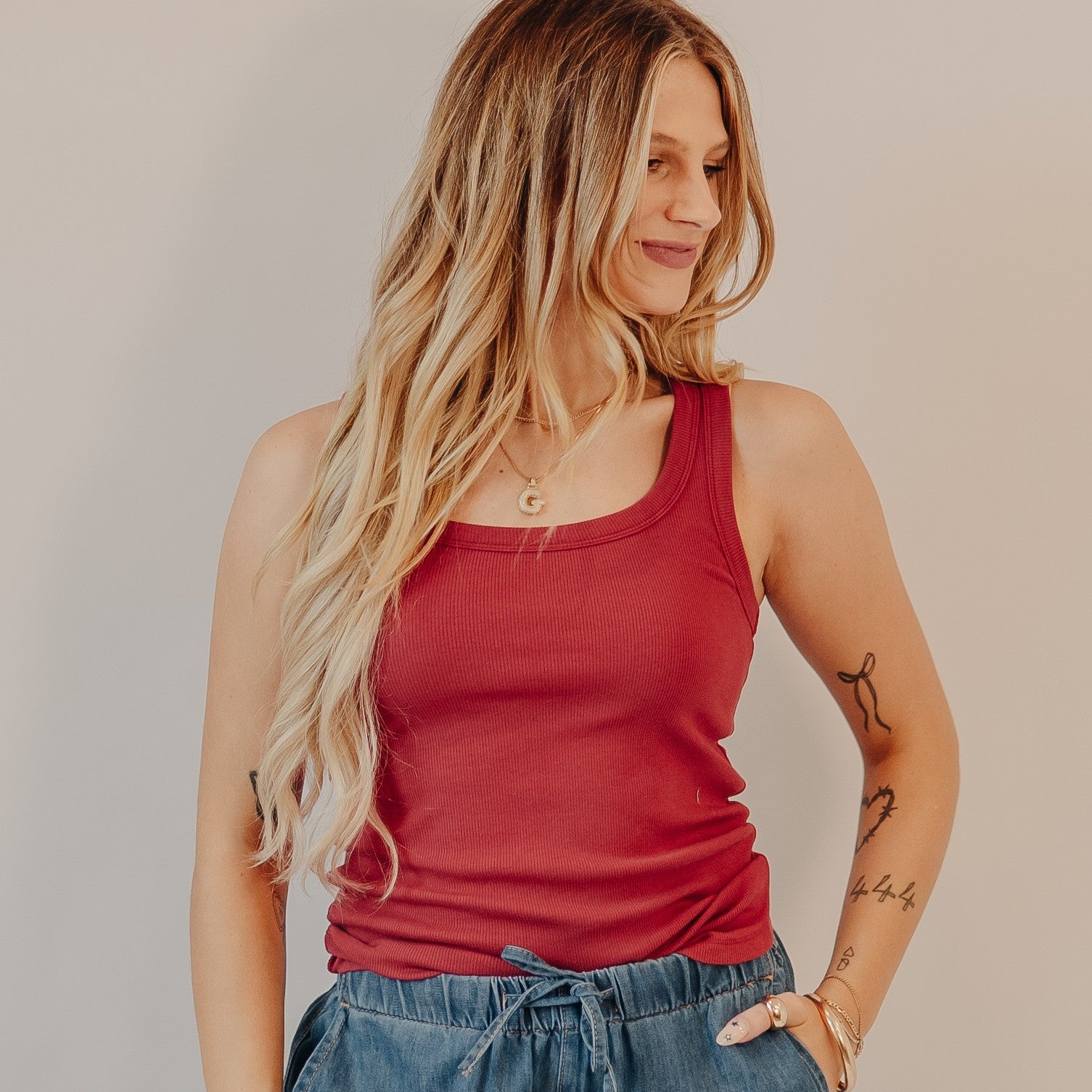 A not-so-basic basic that belongs in every closet. This red ribbed tank features a flattering scoop neckline, fitted silhouette, and just the right amount of stretch. It's soft, sleek, and endlessly layerable—perfect for pairing with distressed denim, your favorite shacket, or worn solo on sunny days.