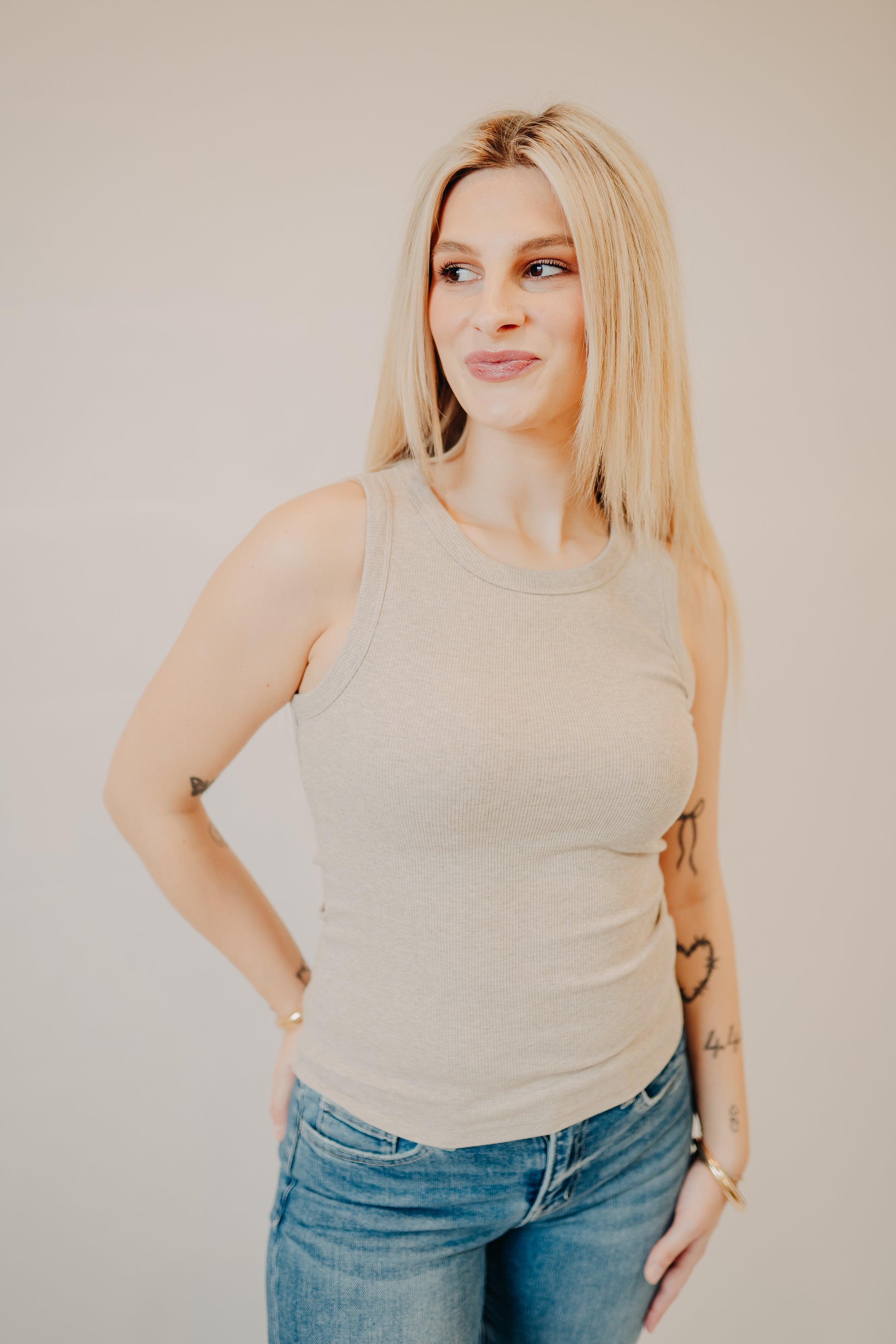 A sleek, neutral ribbed tank that’s soft, flattering, and perfect for everyday layering or wearing solo.
