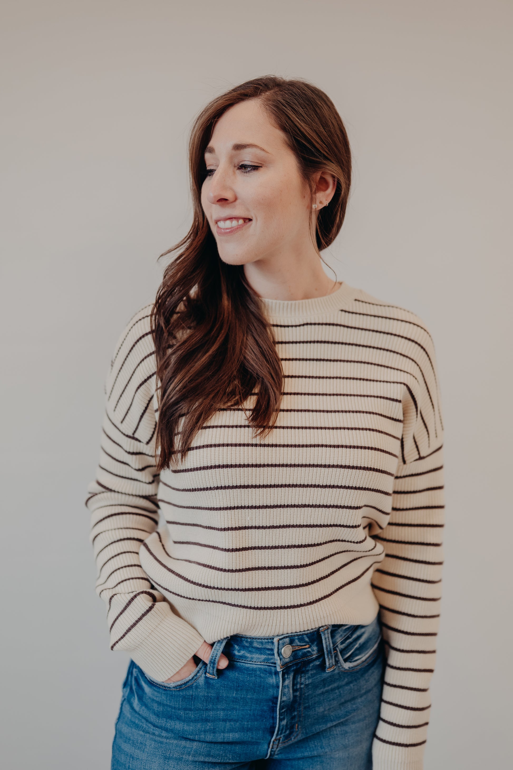 - Thin horizontal stripes, crew neckline, and wide ribbed cuffs and hem