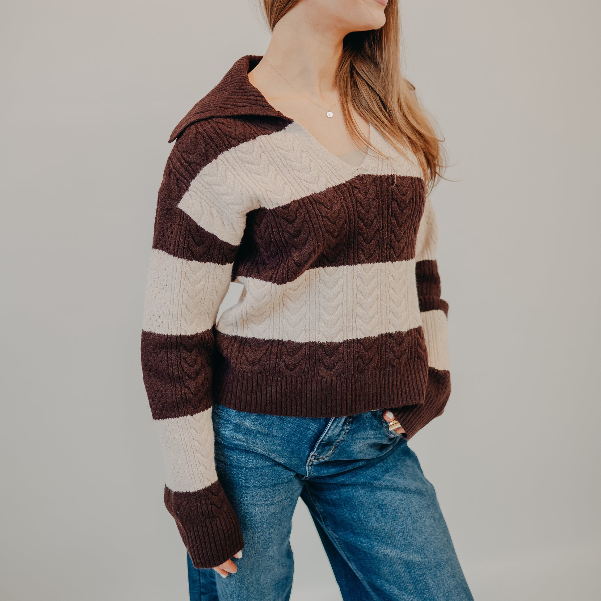 - Soft, textured cable knit with bold chocolate and cream stripes