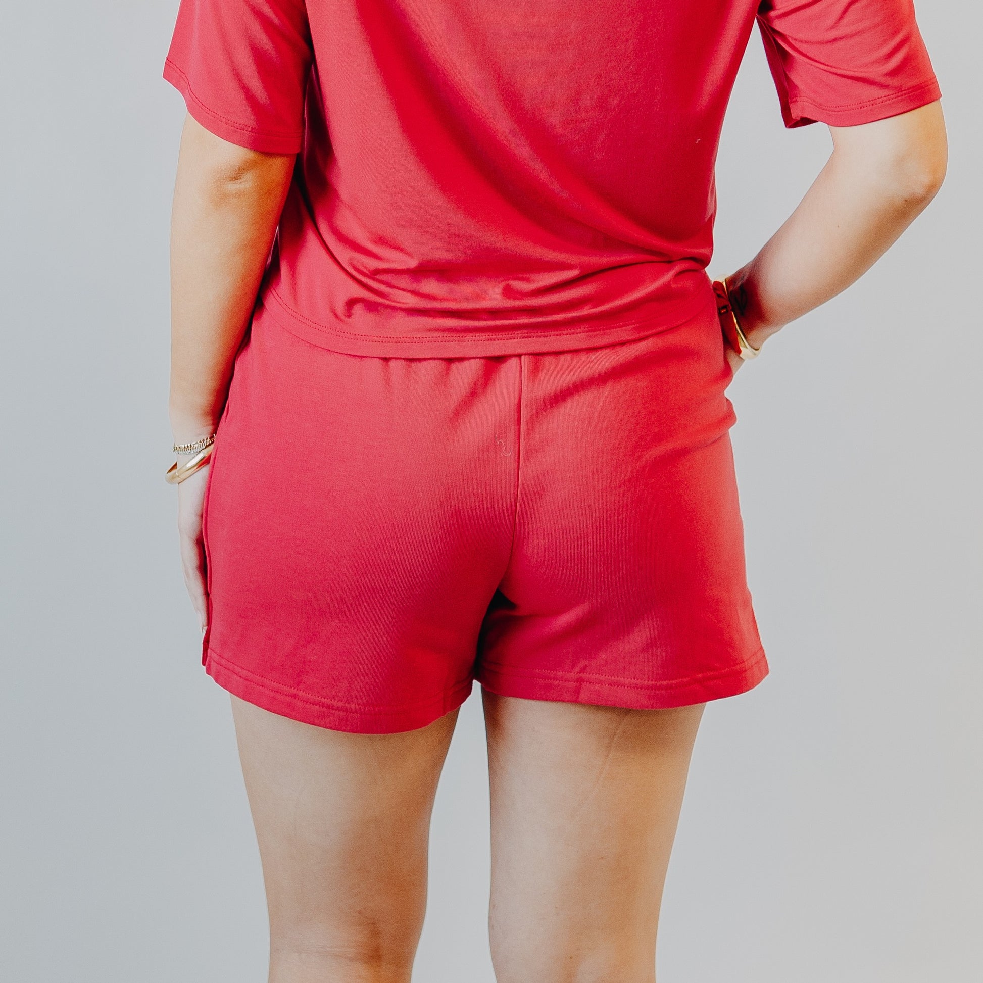 Comfy meets cute in these cherry-red lounge shorts. With a stretchy elastic waistband and smooth, breathable fabric, they’re made for everything from slow mornings to sunny strolls. Side pockets and stitched front detailing add just enough structure to keep them looking polished while feeling like pajamas.