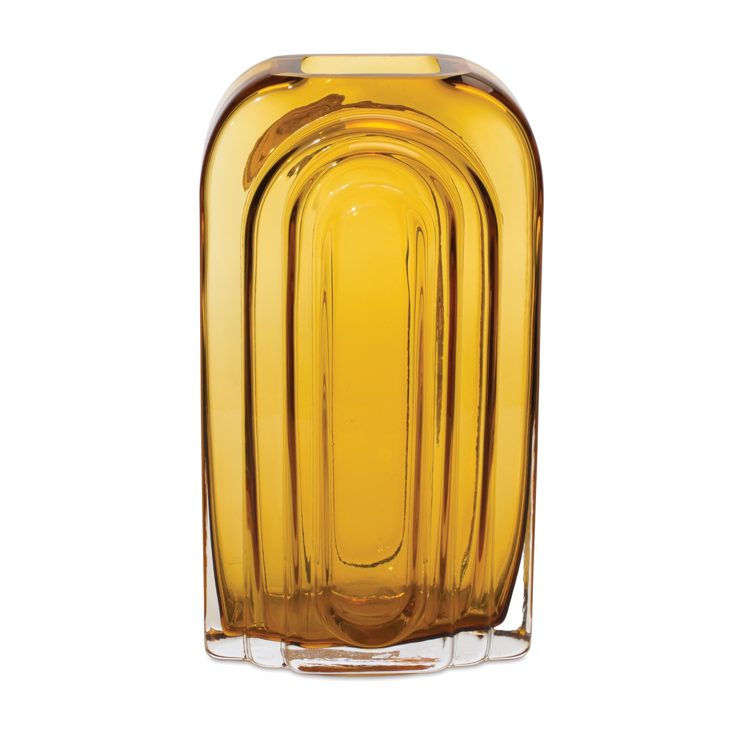 Elevate your decor with this stunning 9.75" amber glass vase, designed in a sleek mid-century modern style. With its warm golden hue and timeless silhouette, this decorative piece adds a sophisticated pop of color to any room. Whether styled with fresh blooms or displayed on its own, this vase transforms ordinary spaces into stylish showcases of personality and charm. Made from durable, high-quality glass, it's a lasting accent perfect for shelves, mantels, or tabletops.