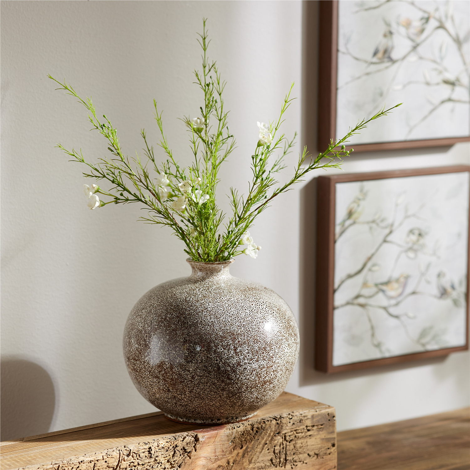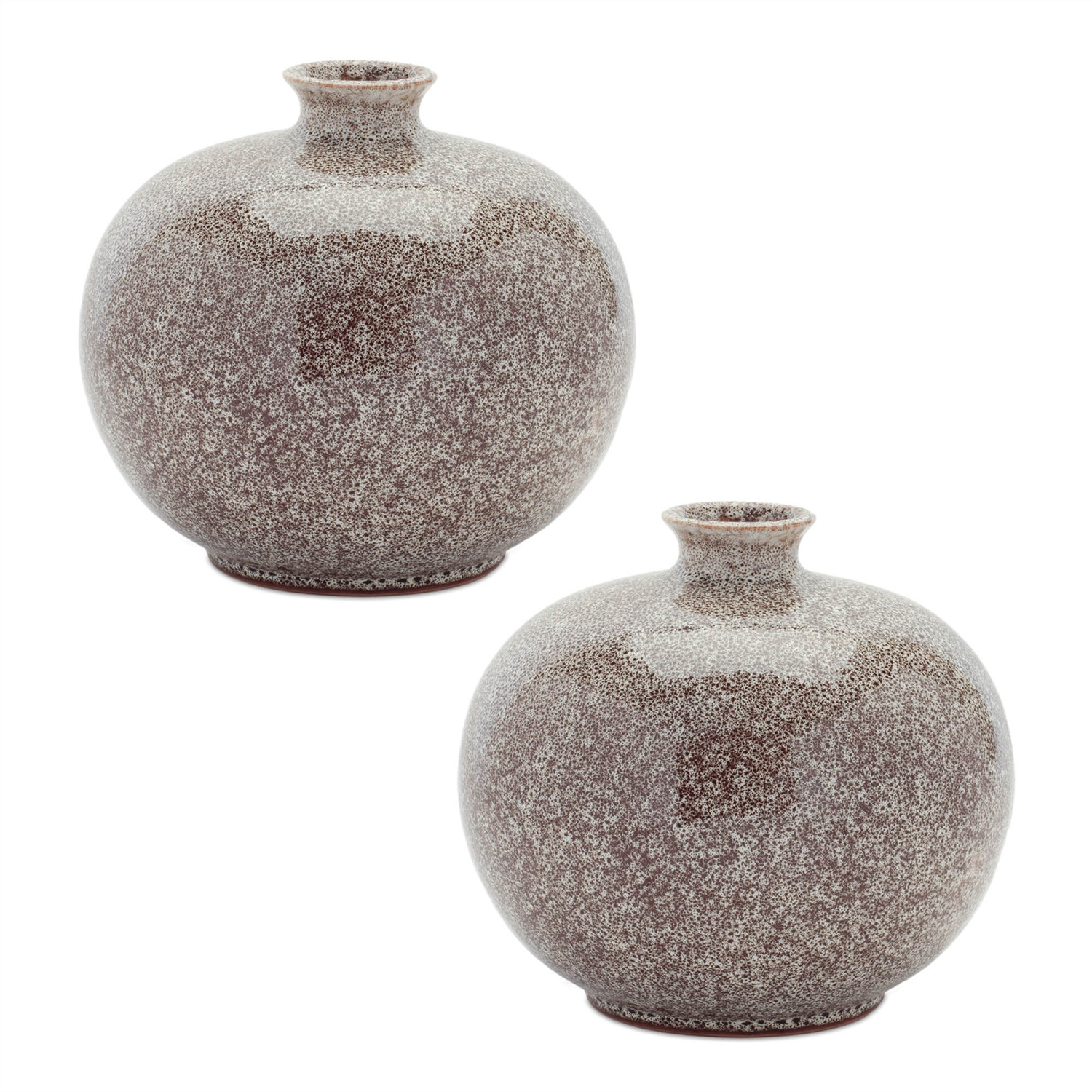 Add earthy charm to your home with this set of two speckled ceramic vases. Featuring a unique blend of earthy brown and beige tones with a shiny glazed finish, these vases showcase an abstract speckled paint design. With a modern rounded shape and bottle neck opening, these vases are perfect for displaying on your bookshelf, mantle, coffee table, or end table. Pair them with a few fresh garden stems or dried florals for an added touch of nature. Sold as a set of two matching pieces, they are an ideal fit for modern farmhouse or rustic-style decor.