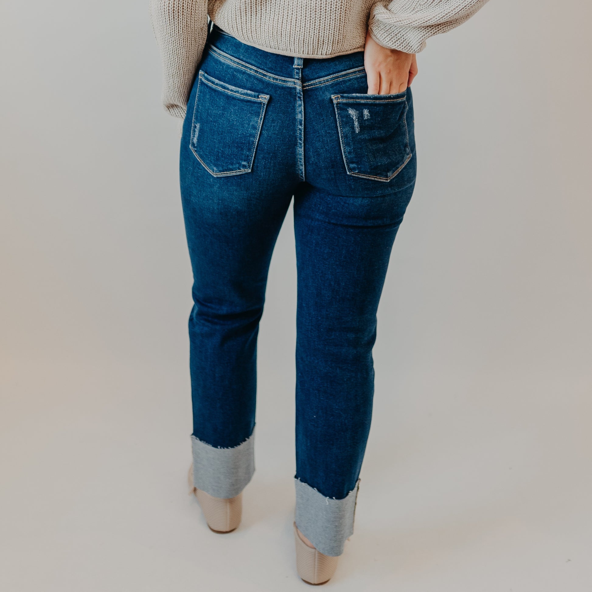 Say hello to your new favorite statement denim. These dark wash cuffed jeans bring a fresh twist to your classic straight-leg style with a bold cuff and subtle raw hem detail. The high-rise fit and flattering straight cut make them perfect for pairing with sneakers, booties, or loafers. Easy to dress up or down — they’re effortlessly cool no matter how you style them.