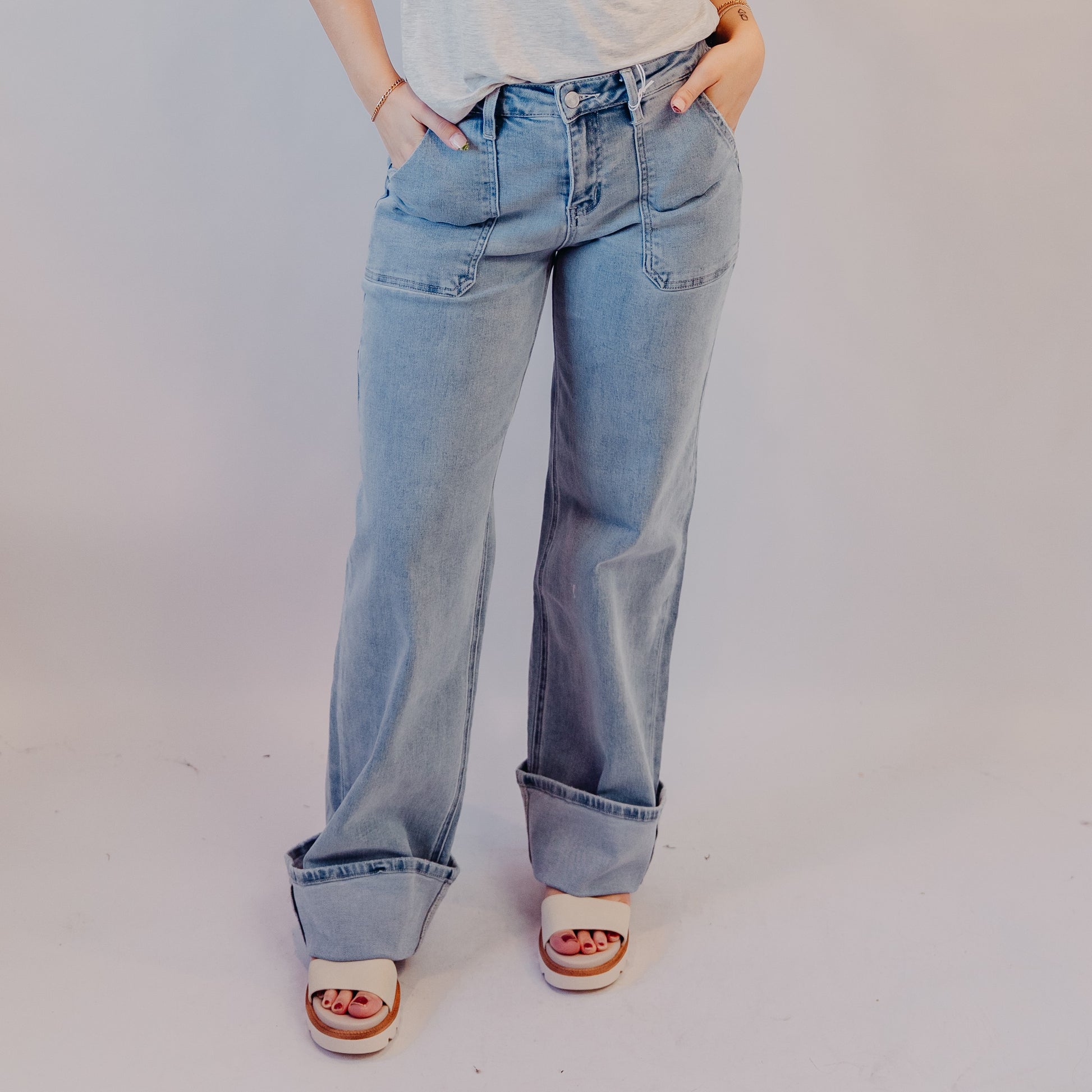 Say hello to your new go-to denim. These wide-leg utility jeans are laid-back yet polished, with oversized pockets and a light vintage wash that gives them that effortlessly cool vibe. The cuffed hem adds a bit of edge, perfect for pairing with platforms or sneakers. Toss them on with a tucked-in tee for market mornings or dress them up with a fitted tank and gold jewelry for an easy dinner out.