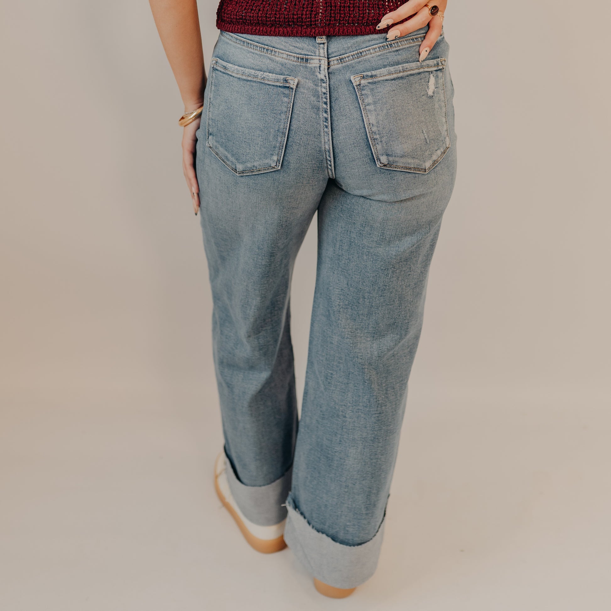 Bring a fresh twist to your denim lineup with these wide-leg cuffed jeans. Featuring a relaxed fit through the leg and an exaggerated cuff hem, they strike the perfect balance between casual and cool. The light wash makes them easy to pair with everything from sweaters to tanks, while the structured shape keeps them looking polished. Style them with sneakers for a laid-back day look or swap in heeled boots for a more elevated vibe.
