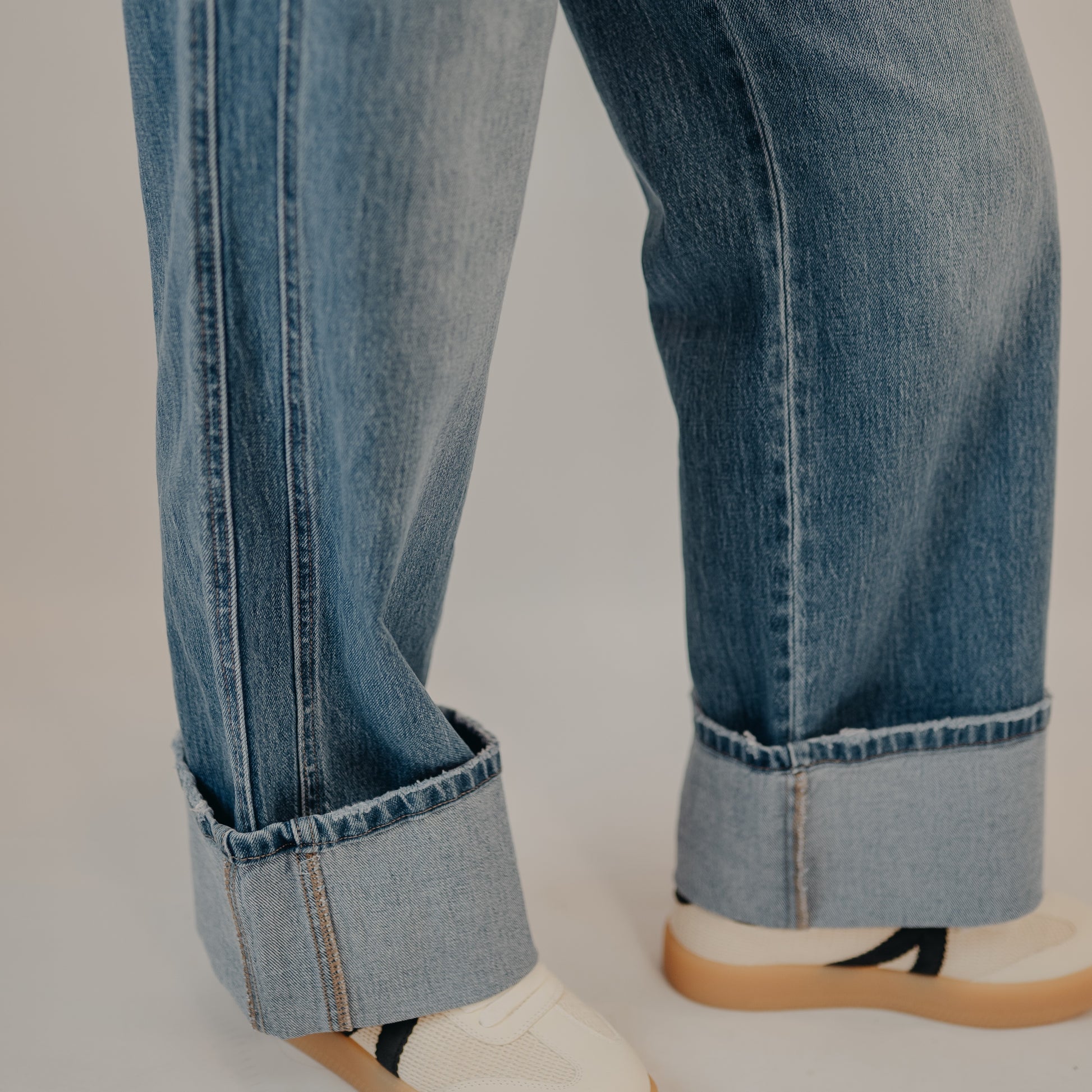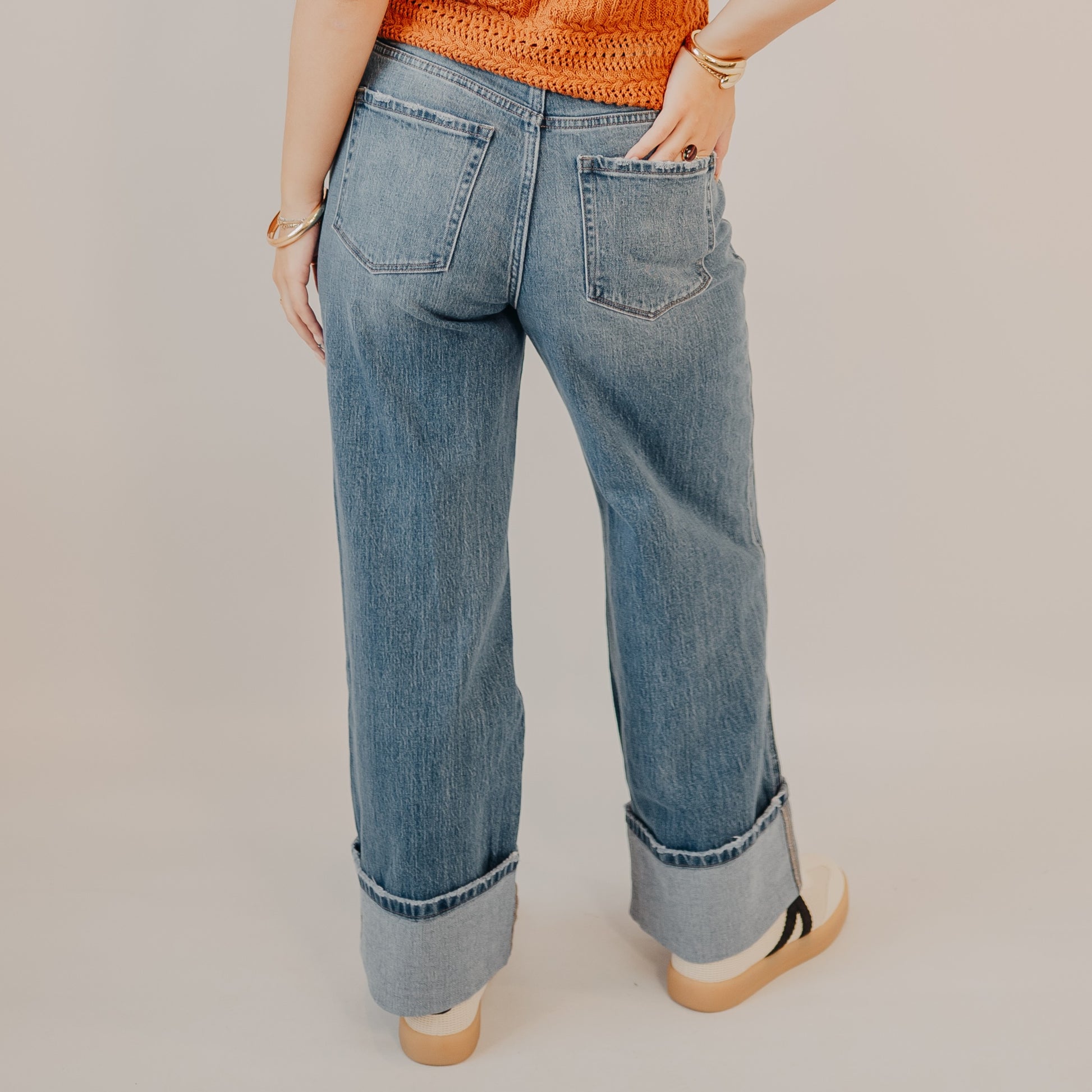 Your go-to denim just got a bold upgrade. These mid-wash jeans feature a structured, wide leg with dramatic cuffs for that effortlessly cool, editorial edge. A double front pocket and subtle side seam detail elevate the design with a unique, thoughtful finish.