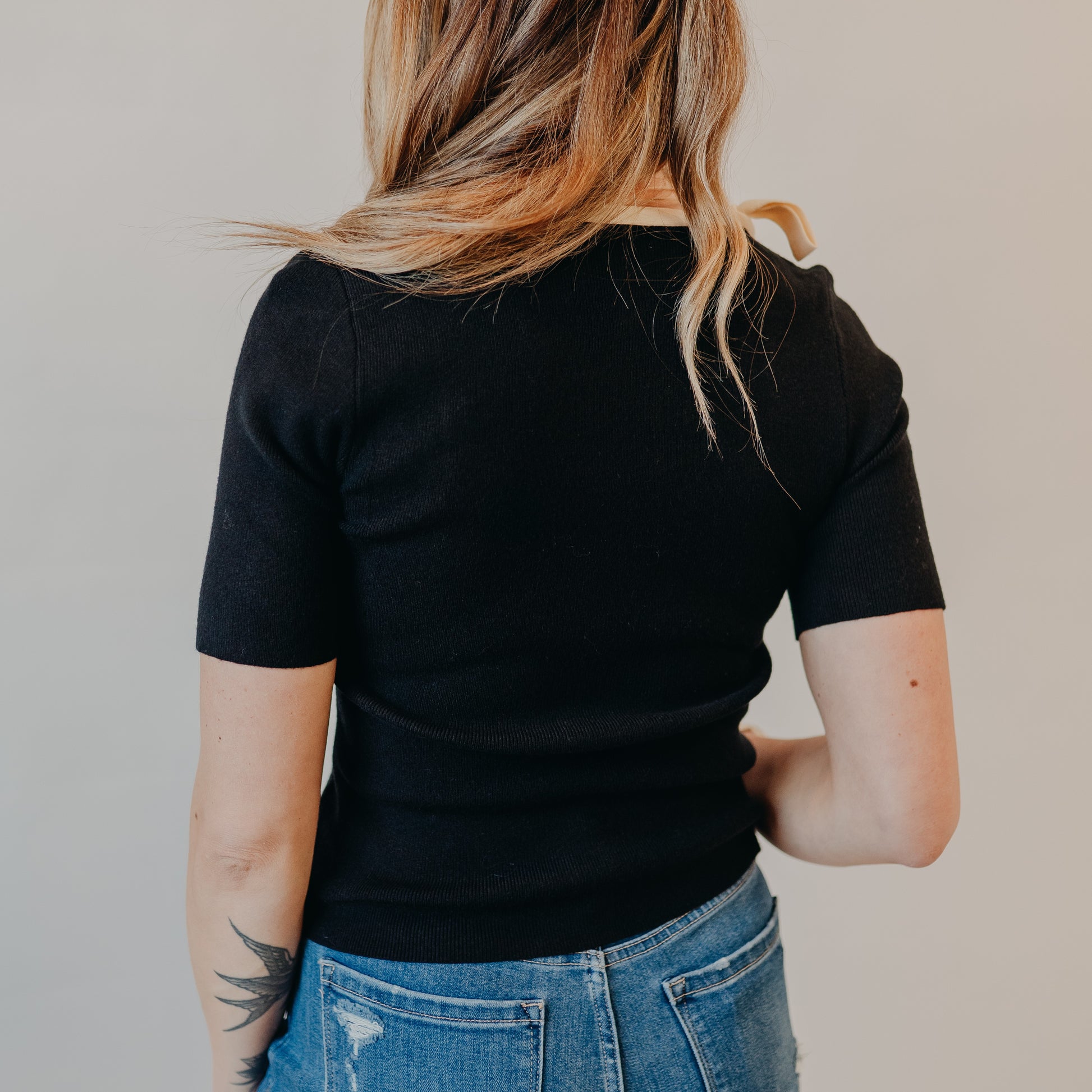 A chic twist on the classic knit, this black short-sleeve top features a feminine cream trim and bow-tie detail at the shoulders. The square neckline adds a flattering touch, making it an easy go-to piece for dressing up or down. Pair it with your favorite denim for a casual look or tuck it into a skirt for something more polished.