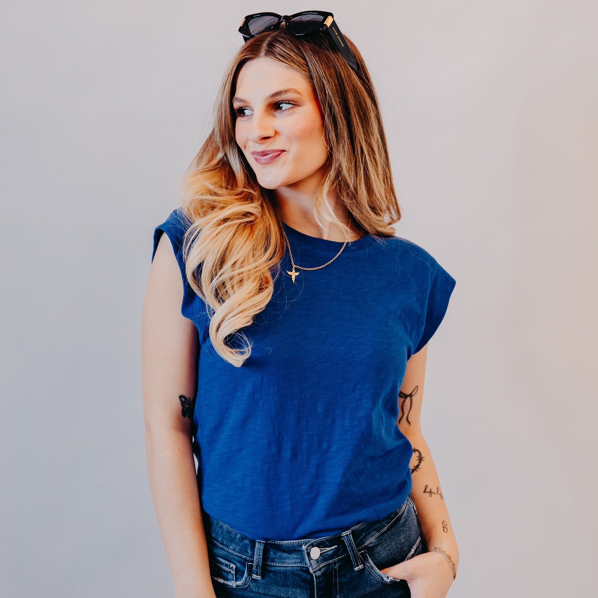 Bright, clean, and totally effortless—this vibrant cobalt cap sleeve tee is a closet essential with a twist. The tailored seam down the back adds structure, while the rolled sleeves and soft cotton feel keep it easygoing. Perfect for lake weekends, casual Fridays, or layered under a blazer for a fun pop of color.