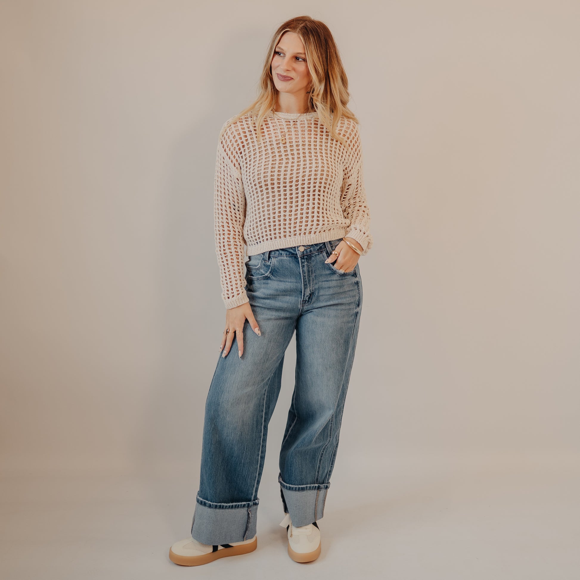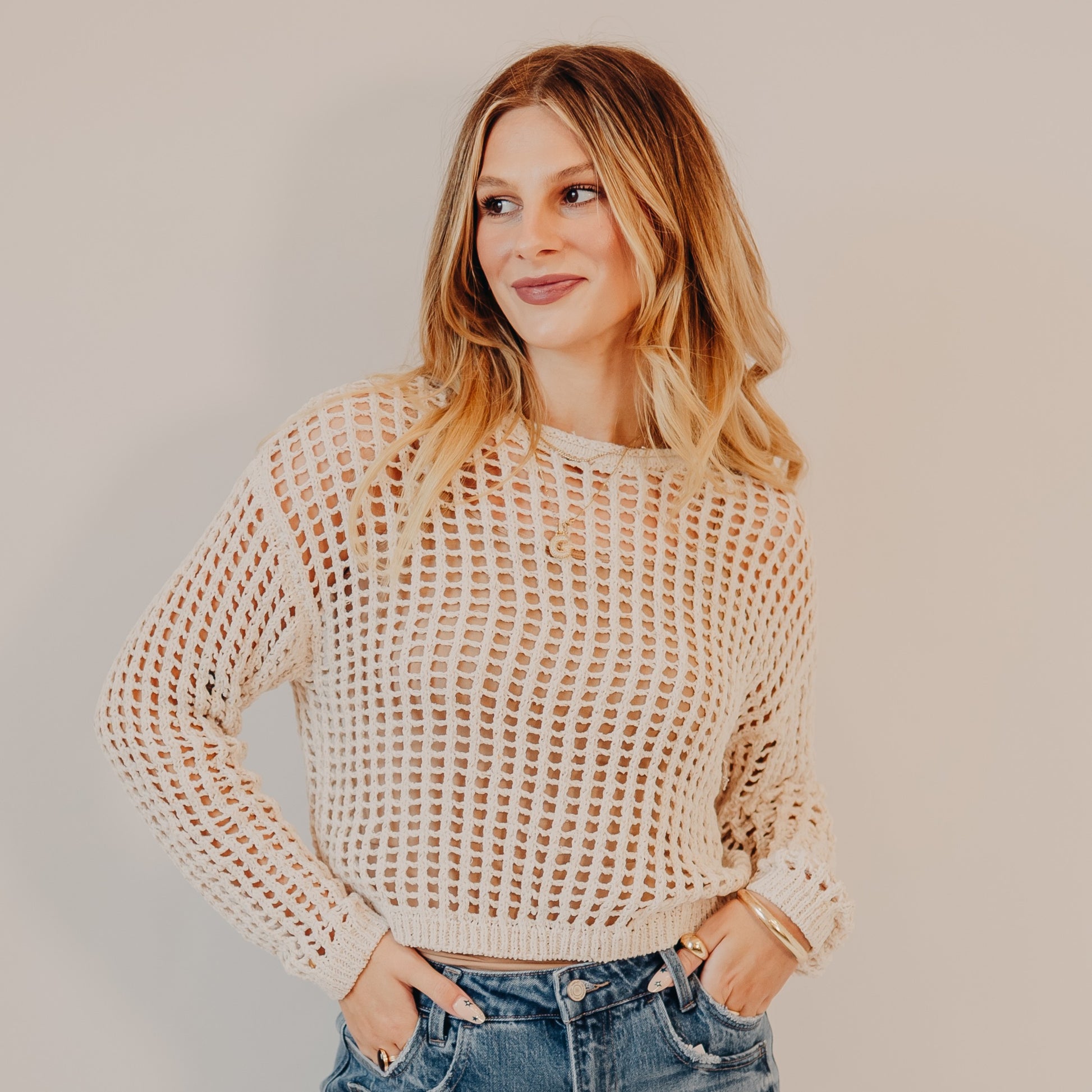 Say hello to your go-to layering piece for late summer into fall. This cream open-knit sweater adds a breezy texture with its wide woven grid pattern, giving you that effortless, relaxed feel. Wear it over a tank or bralette, pair it with high-rise denim or a maxi skirt, and you’re set for a cozy, coastal vibe.