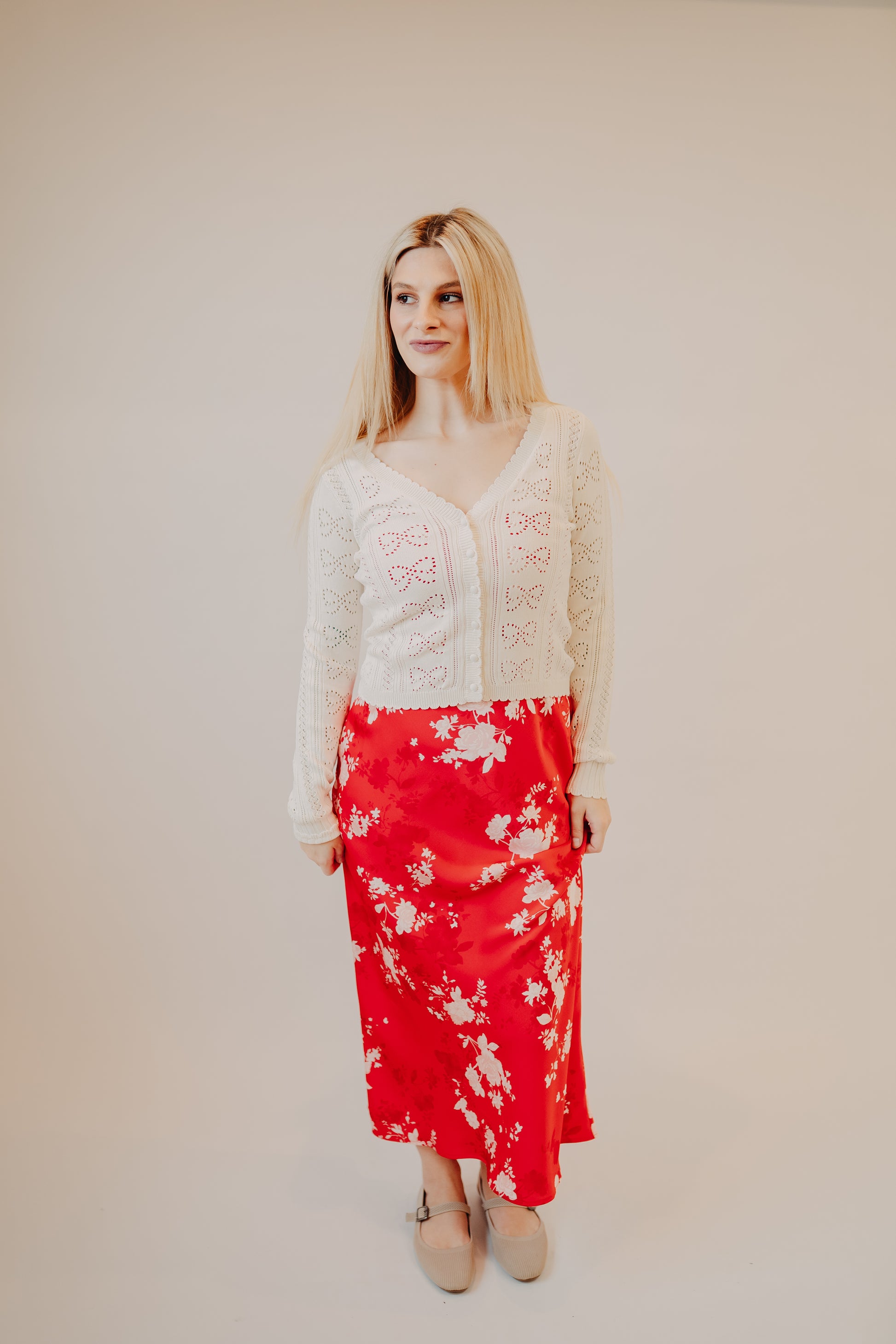 A delicate, cropped cardigan with dainty bow eyelet detailing and soft scalloped edges—romantic, vintage-inspired, and perfect for layering over dresses or wearing buttoned up on its own.