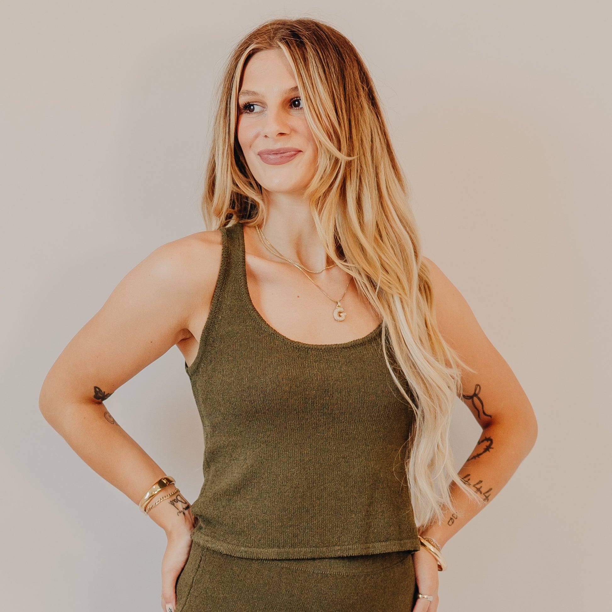 A closet staple with a chic twist — this olive knit tank is soft, minimal, and endlessly versatile. Designed in a lightweight sweater knit, it’s an easy piece to wear solo on warm days or layered under a jacket when the weather cools. Pair it with the matching maxi skirt for a coordinated set, or keep it casual with your favorite denim shorts.