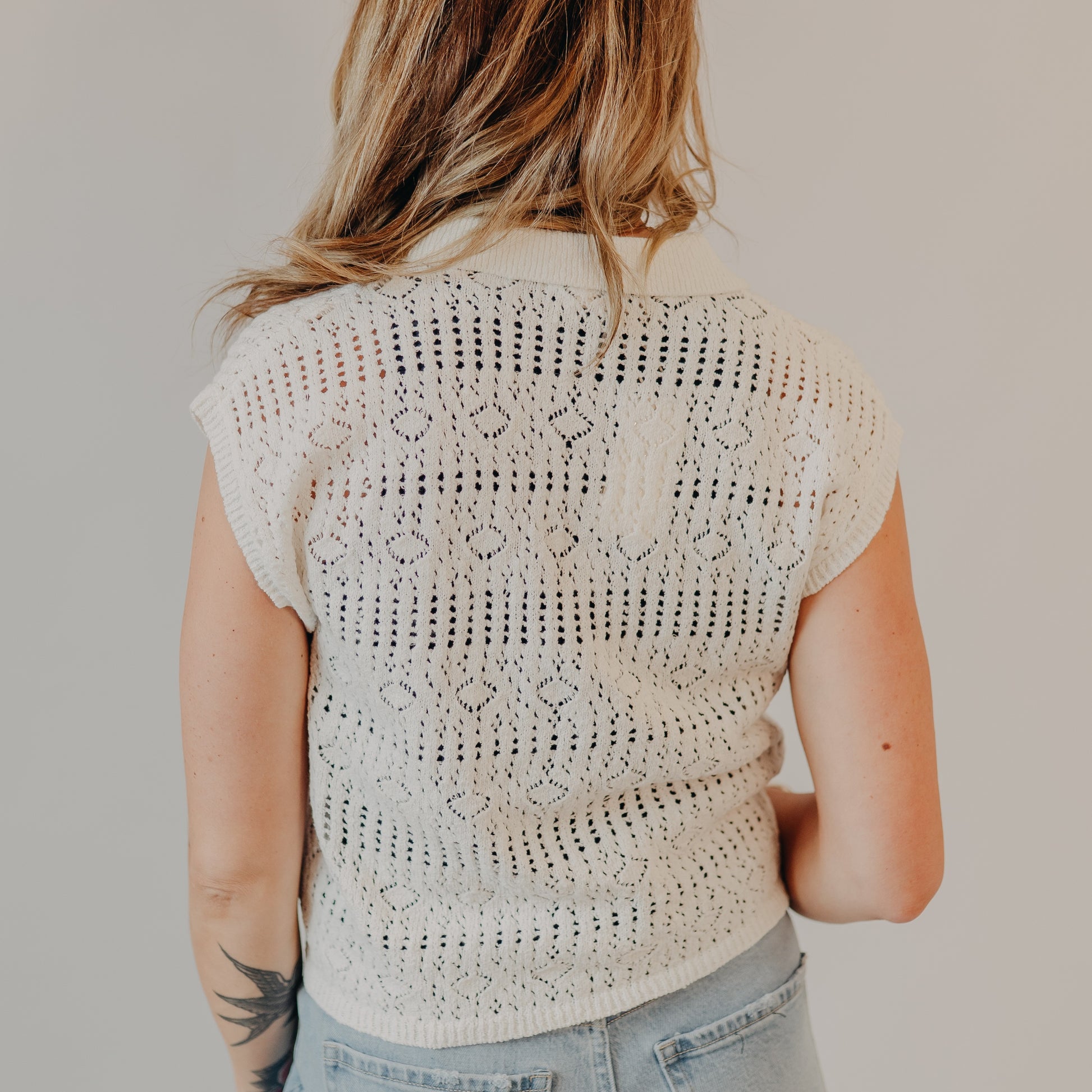 This sleeveless crochet button top is a chic layering piece that can be styled on its own or paired with your favorite denim. The lightweight knit features a collared neckline, button-down front, and subtle open-weave texture that keeps it breezy and effortless. We love it tucked into wide-leg jeans for a modern, casual look or layered under a jacket as the seasons shift.