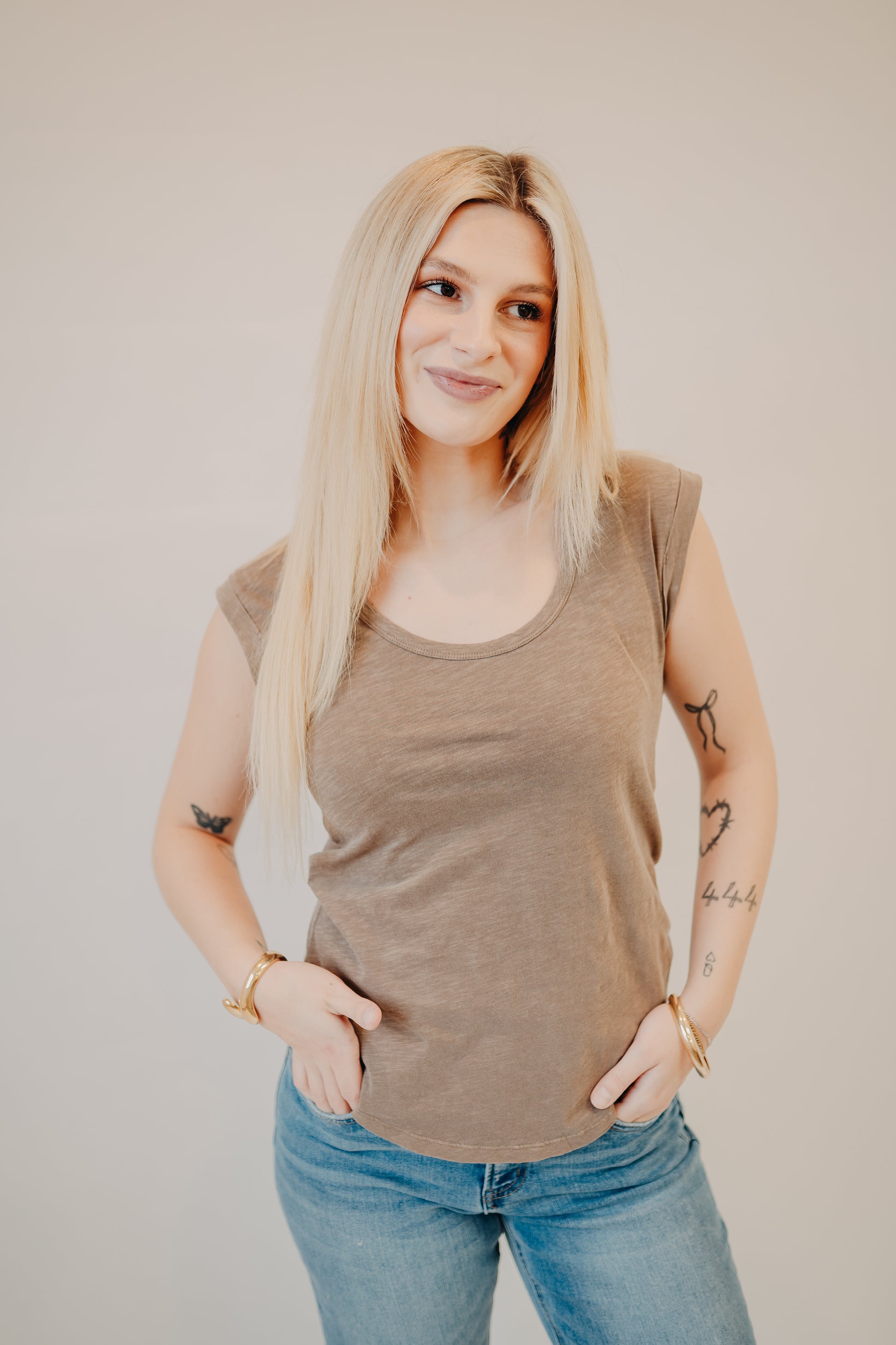 - Scoop neckline with cap-style sleeves for an easy everyday shape